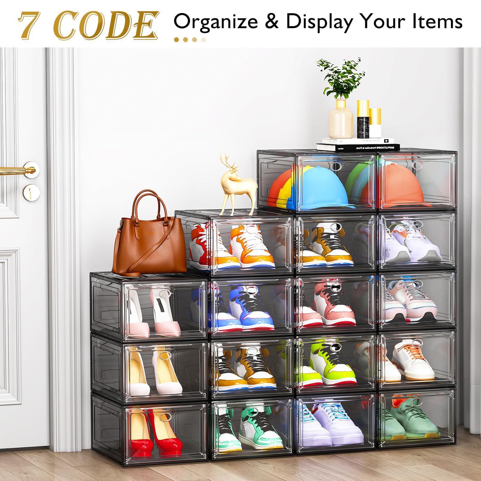 - 【Clear & Stackable Design】Easy to Use & Space-Saving Featuring a transparent magnetic front door and stackable design, these shoe boxes allow you to easily see and access your shoes. The interlocking pegs ensure safe and stable stacking, creating multiple layers of organized shoe storage