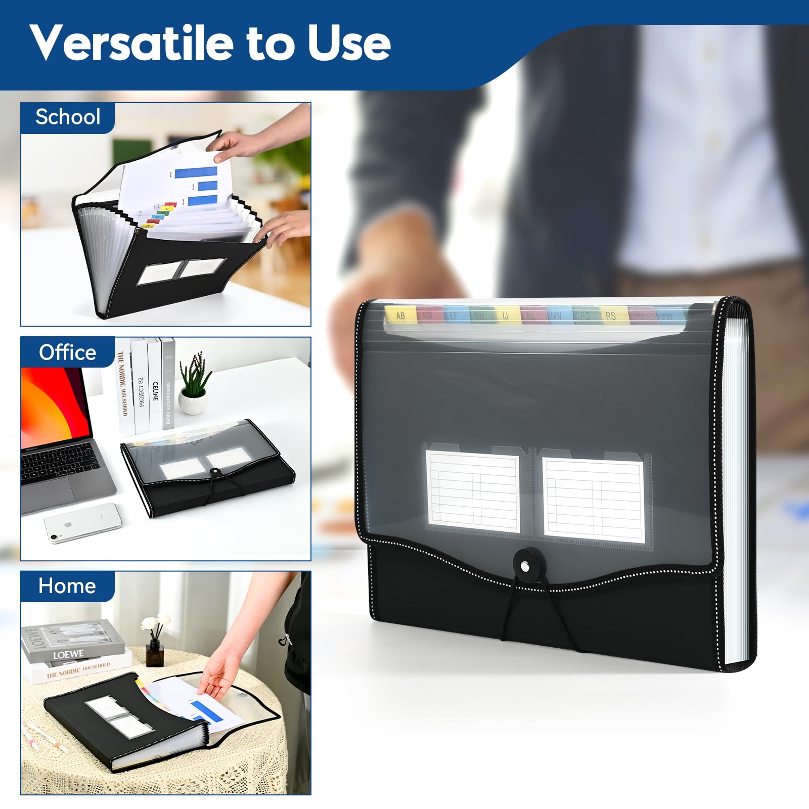 12-Pocket-Expanding File-Folder,Accordion-File-Organizer, A4/US Letter Size Paper Receipt Organizer Accordian Filing Folders (Black-T-12 Pockets)