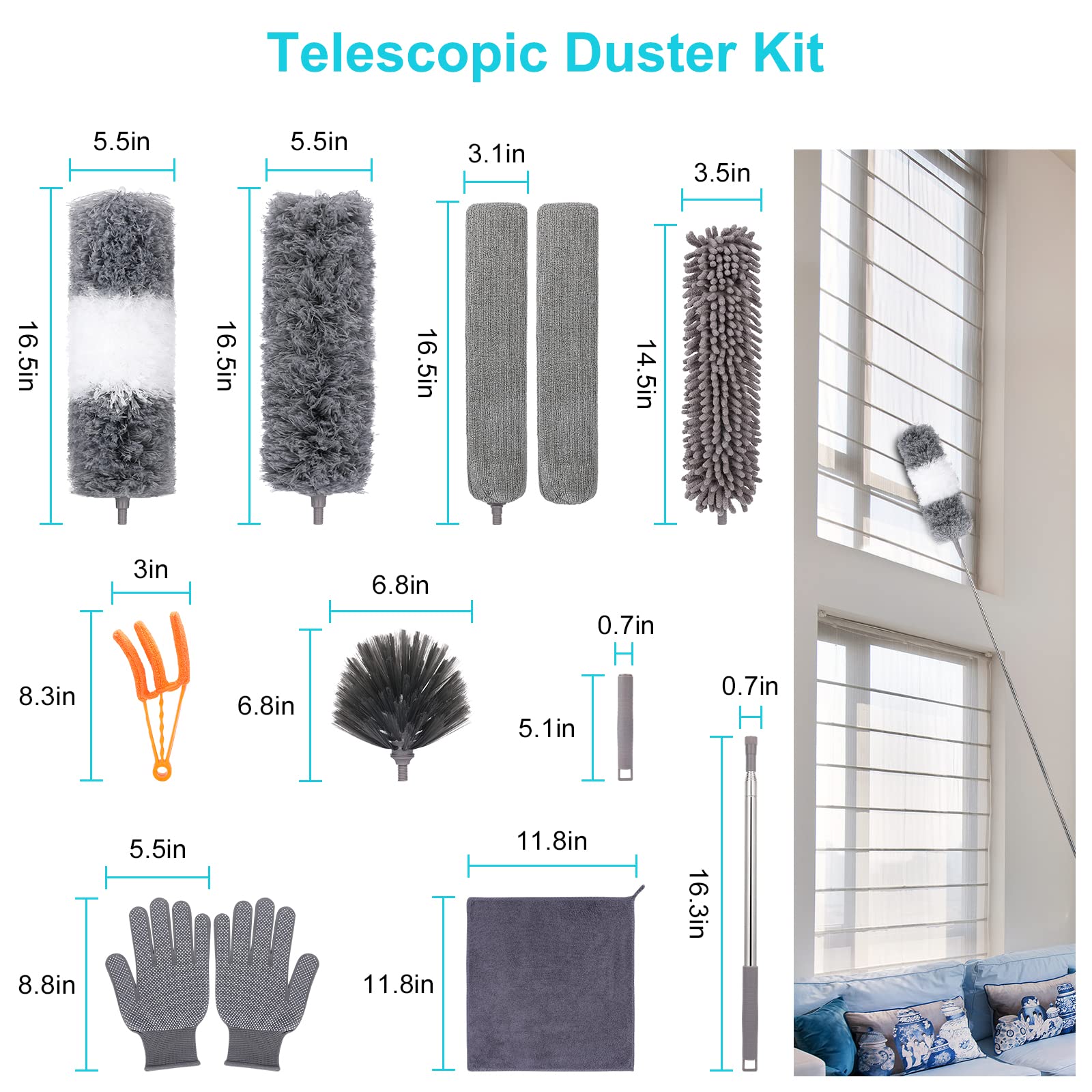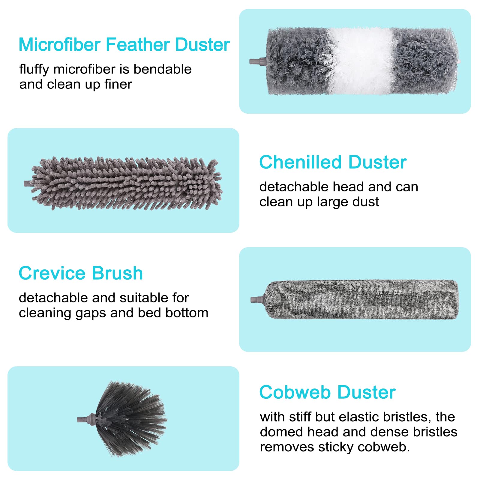 - ✅12 PCS Feather Duster Kit: This microfiber hand duster set includes 2m Telescopic Pole, 1 Bendable Microfiber Duster Head, 2 Chenille Duster Head, 1 Cobweb Duster Head and 2 Crevice Brush, 1 blinds duster, 1 Microfiber Cleaning Cloth and 2 5in short handle, A pair of grey gloves. Replacing different types of duster brush heads can handle different cleaning scenarios, keeping your home away from dust.