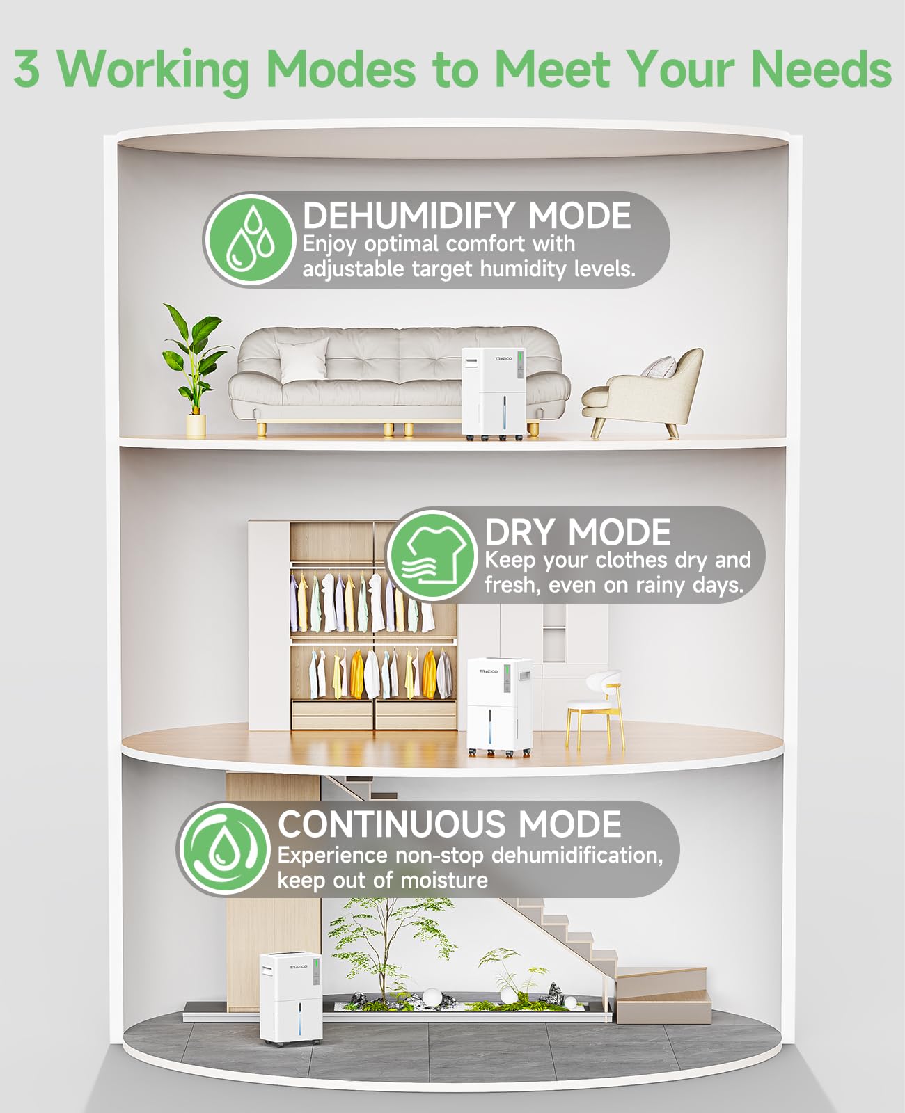 - 3 Versatile Dehumidification Modes - Elevate your indoor comfort with our bedroom dehumidifier’s 3 dynamic modes! The DEHU mode, effortlessly adjust humidity from 30% to 80% to create your ideal space, the DRY mode is perfect for quickly drying delicate clothes, the CONT mode effectively tackles moisture. Whether it’s a rainy day or a muggy night, easily choose the mode that fits your needs and enjoy a refreshing home atmosphere!