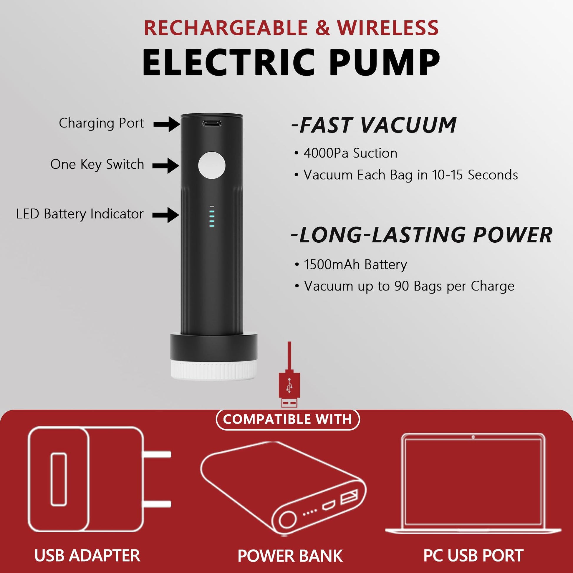 - Rechargeable & Wireless Electric Pump: Effortlessly enhance your packing and storage efficiency with our state-of-the-art wireless electric pump. Powered by a 1500mAh battery, it allows up to 90 vacuum sealing per charge. With 4000Pa suction, it can compress a bag in 10-15 seconds.