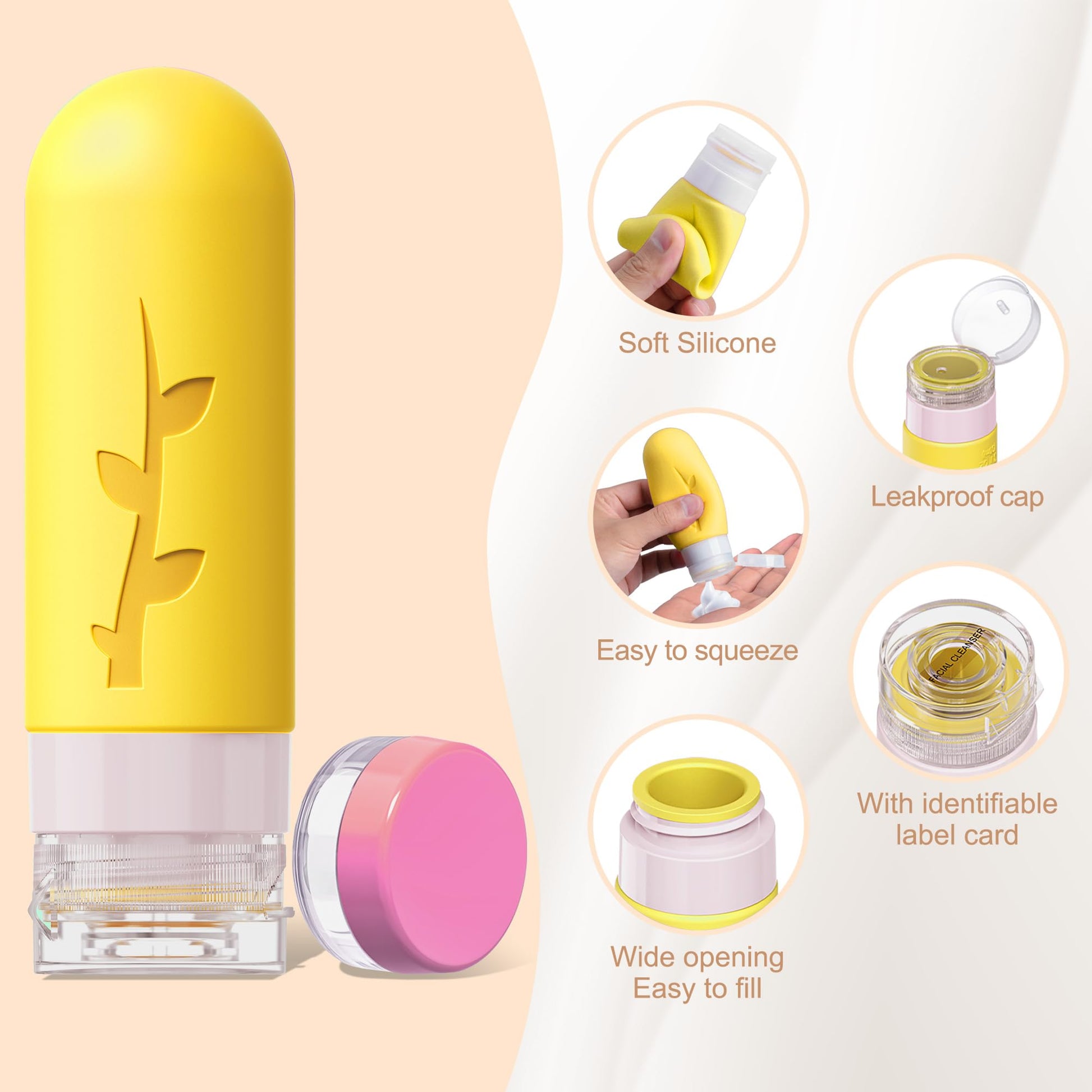 - Designed for Travel Accessories: Our 18 pack reusable travel bottles set with 1 waterproof bag, 2 pcs silicone bottles (3 oz/90 ml), 2 pcs silicone bottles (2 oz/60 ml), 2 pcs spray bottles , 4 pcs cream jars (0.35 oz/10 ml), 1 pcs funnels, labels, brush and 4 pcs spatula! Different accessories for your different needs