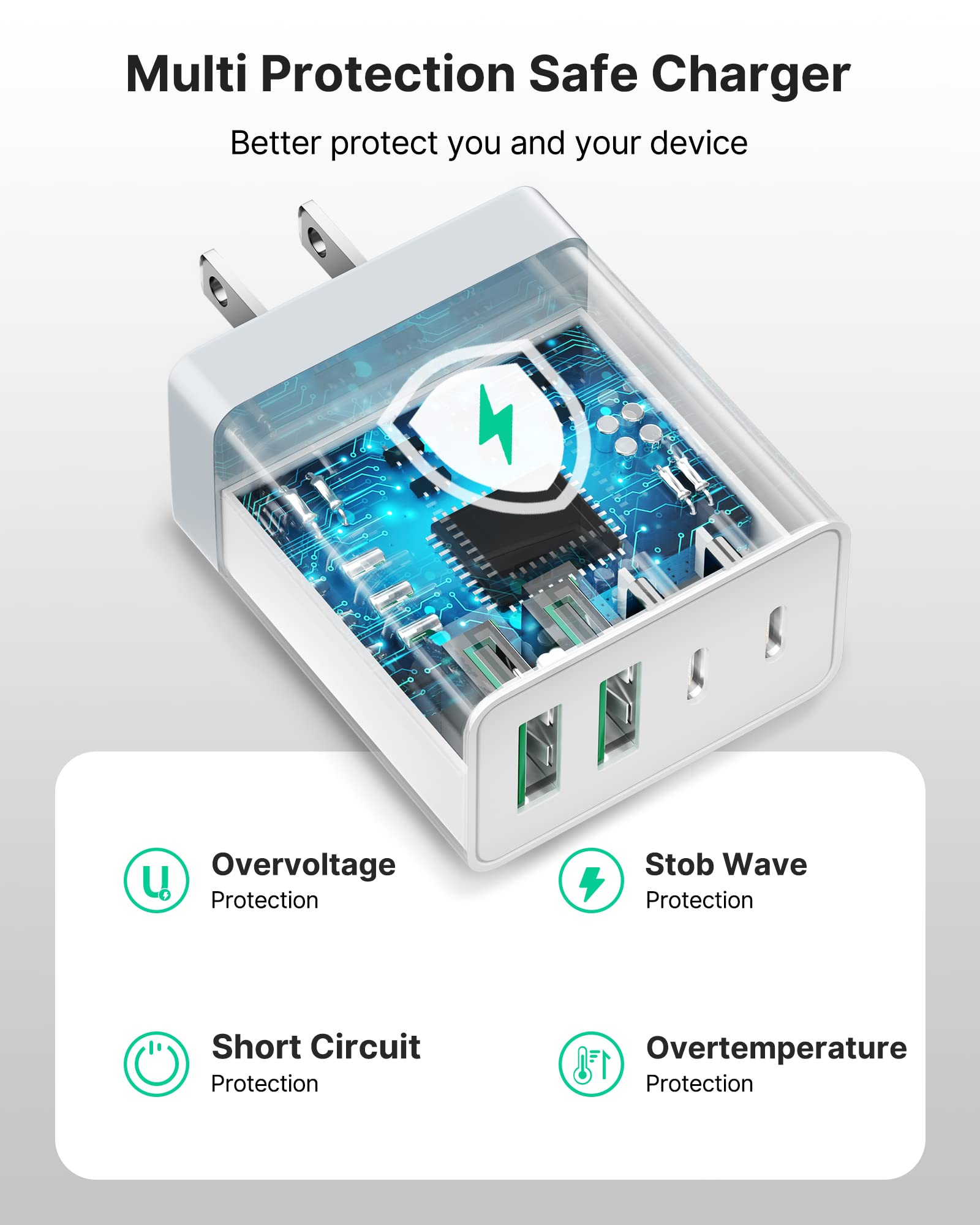 - 【Complete Safety & Reliability】:Certified RoHS,CE & FCC,protect devices from overheated and over-currents,overcharging,and short circuits,charging will be automatically stopped when the battery is full. The USB C Wall Plug is made of ABS + PC fireproof material,ensuring that your digital device always charges safely