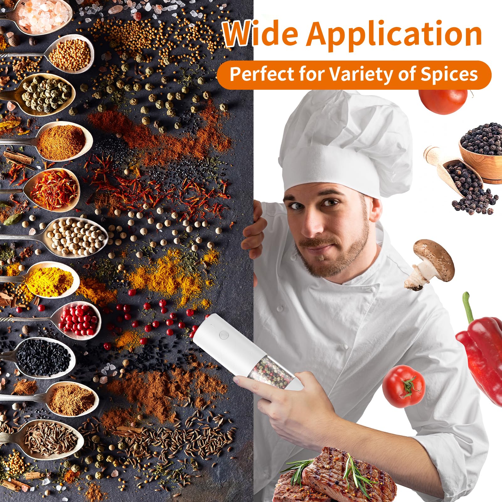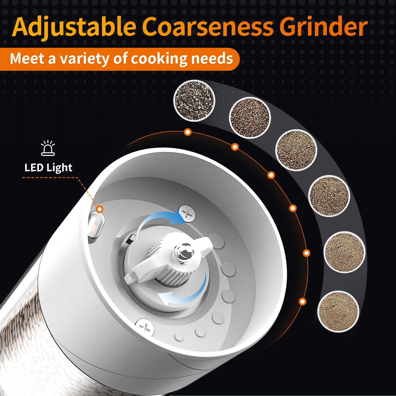 - Warm White LED Lights: The rechargeable mills come with a convenient bright and soft LED light, illuminating your food for easy and accurate seasoning. No more guessing if you've added enough salt and pepper, the light will help you see exactly where you're milling, and create an atmosphere that makes the food more delicious and the surroundings more warm and romantic! Type-C fast charge enjoy more than 250 grinds on a single charge! Make cooking easier and more efficient