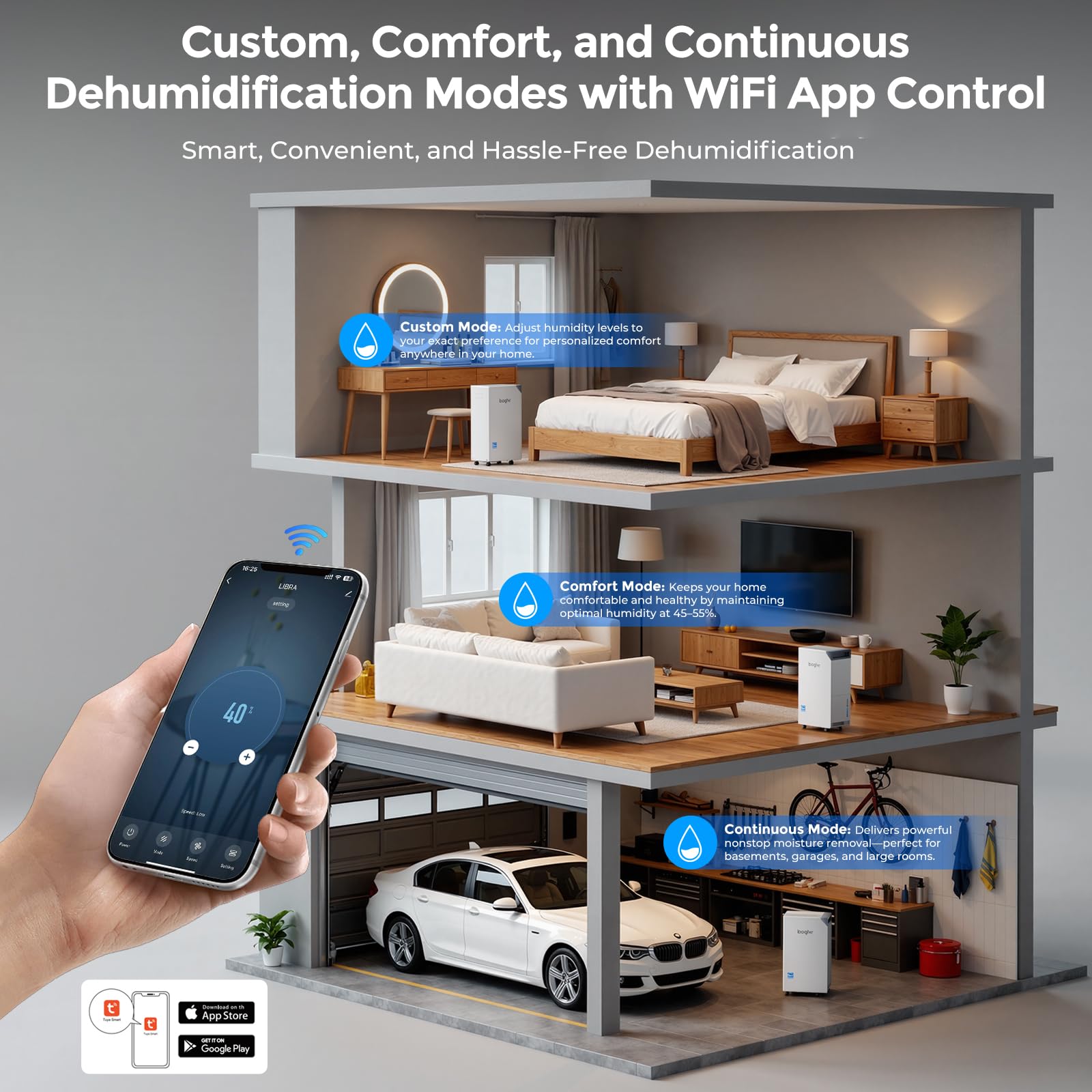 - 【3 Intelligent Modes for Personalized Comfort】Easily adapt to any environment with three smart modes: Custom Mode for precise humidity control in any room, Comfort Mode maintains ideal 45–55% humidity for daily living spaces like bedrooms or living rooms, ensuring a cozy and healthy atmosphere, and Continuous Mode delivers powerful, nonstop dehumidification for damp areas such as basements or during rainy seasons, quickly removing excess moisture.