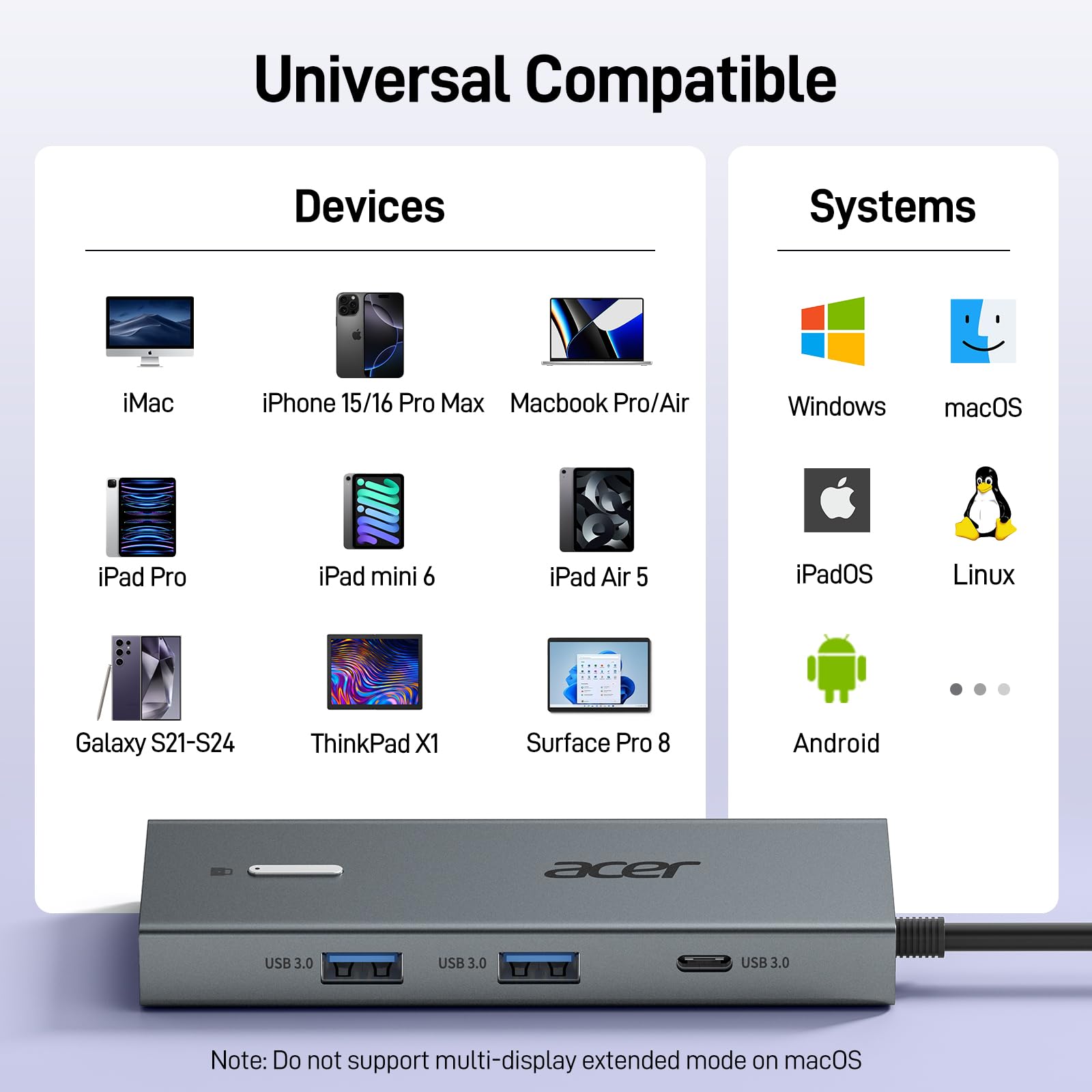 - ใ100W PD Fast Charging, Efficient Power SupplyใThis Acer USB-C hub supports up to 100W input and delivers up to 90W to your laptop, allowing you to stay charged while using the docking station. ๐๐๐จ๐ญ๐: โ ๐๐ง๐ฌ๐ฎ๐ซ๐ ๐ฒ๐จ๐ฎ๐ซ ๐๐๐ฏ๐ข๐๐โ๐ฌ ๐๐๐-๐ ๐ฉ๐จ๐ซ๐ญ ๐ฌ๐ฎ๐ฉ๐ฉ๐จ๐ซ๐ญ๐ฌ ๐๐จ๐ฐ๐๐ซ ๐๐๐ฅ๐ข๐ฏ๐๐ซ๐ฒ (๐๐); ๐ฎ๐ฌ๐ ๐ ๐๐๐+ ๐ฉ๐จ๐ฐ๐๐ซ ๐๐๐๐ฉ๐ญ๐๐ซ (๐ง๐จ๐ญ ๐ข๐ง๐๐ฅ๐ฎ๐๐๐).