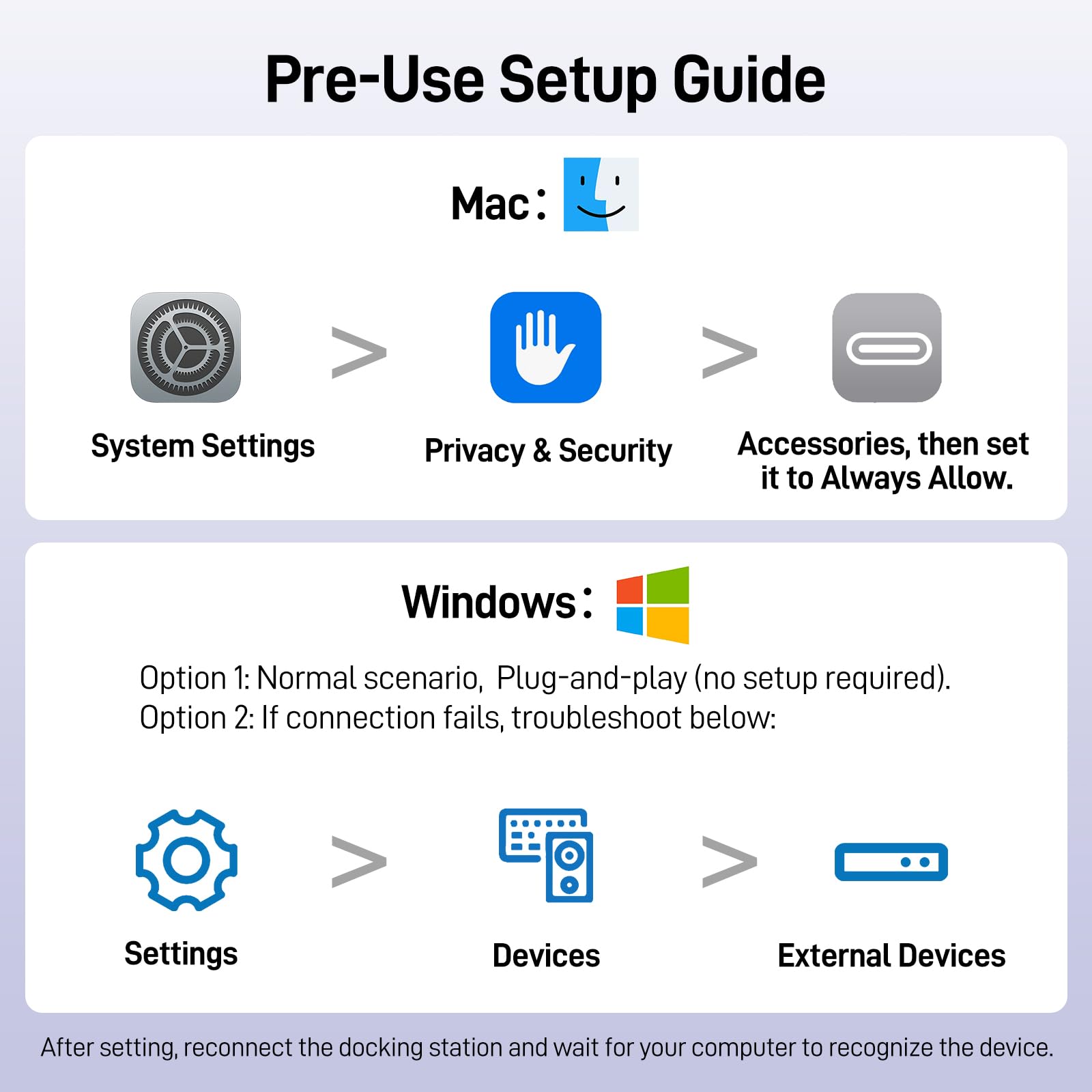 - ใ๐๐ซ๐-๐๐ฌ๐ ๐๐๐ญ๐ฎ๐ฉ ๐๐ฎ๐ข๐๐ใ๐ ๐จ๐ซ ๐๐๐: System Settings > Privacy & Security > Accessories, then set it to Always Allow. ๐ ๐จ๐ซ ๐๐ข๐ง๐๐จ๐ฐ๐ฌ: Plug-and-play ready, enable external devices in Settings > Devices. After setting, reconnect the docking station and wait for your computer to recognize the device.