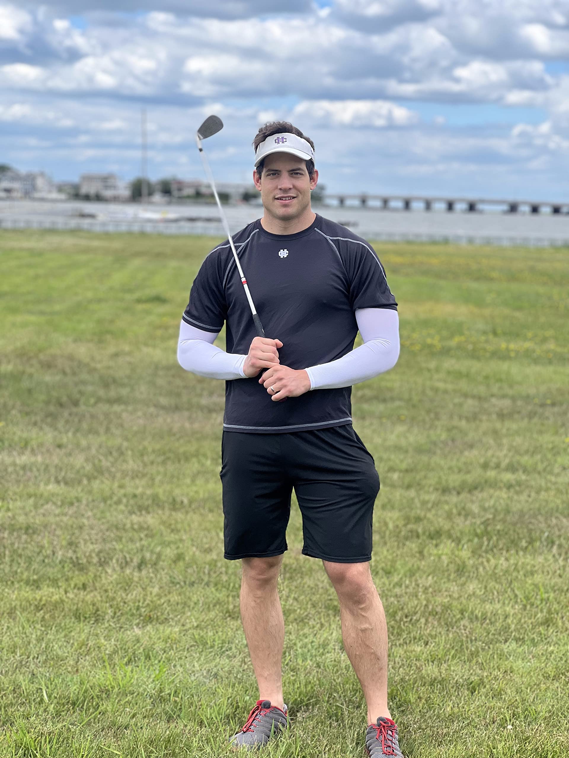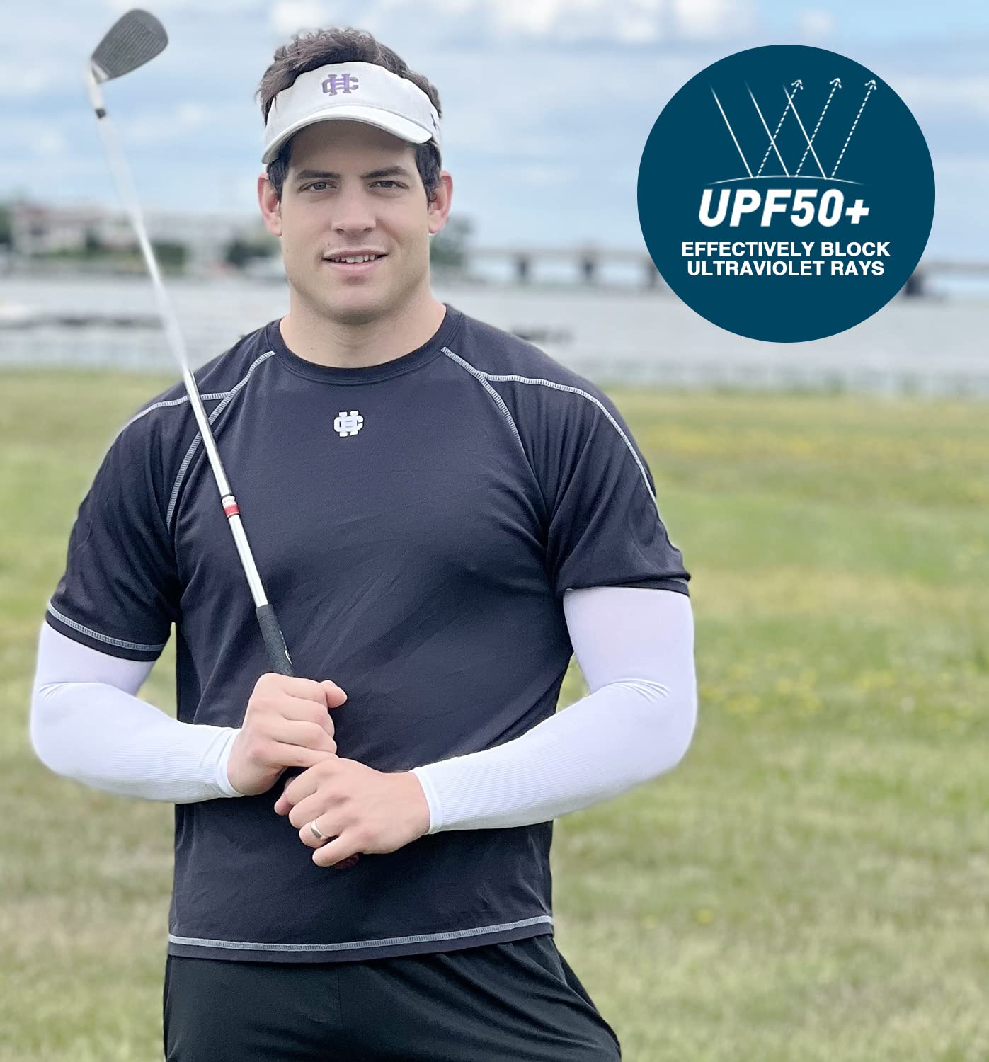 - All-Round Sun Protection - UPF 50+ protective technology works great to keep the harmful sun rays off your skin when golfing, shooting, running, bike riding, etc. No need for greasy sunscreen or long sleeves shirts. These uv sun protection arm sleeves shield your arms from sunburn and skin damage during long days in sun.