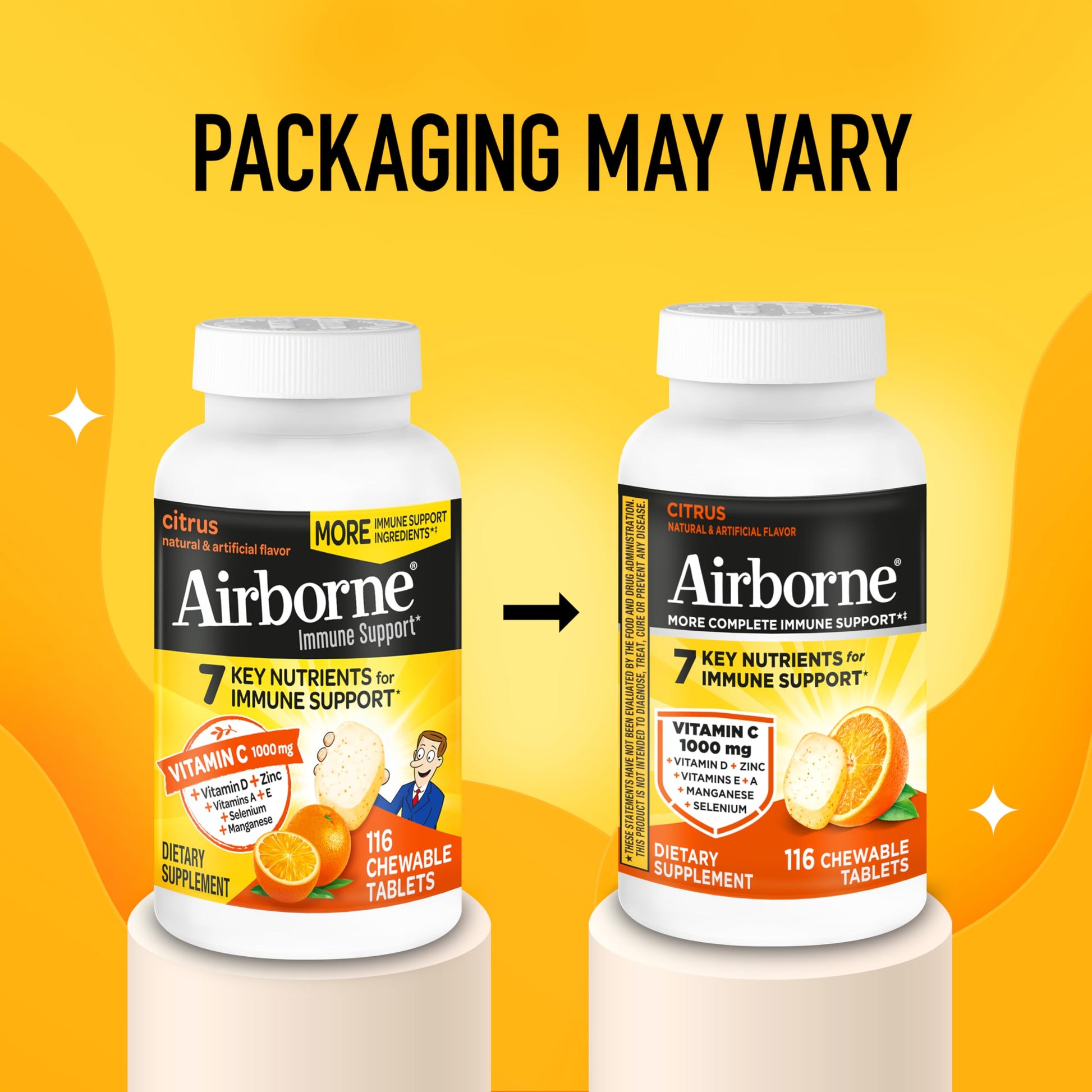 Airborne Vitamin C 1000mg (per Serving) - Citrus Chewable Tablets (116 Count in a Bottle), Gluten-Free Immune Support Supplement, with Vitamins A C E, Zinc, Selenium, Echinacea, Ginger, Antioxidants