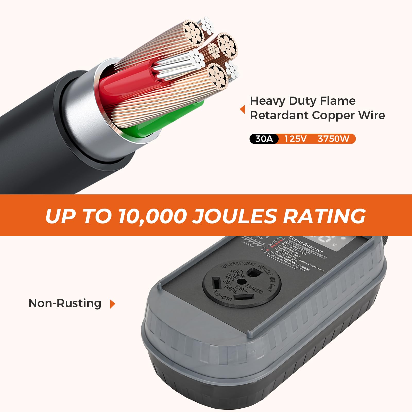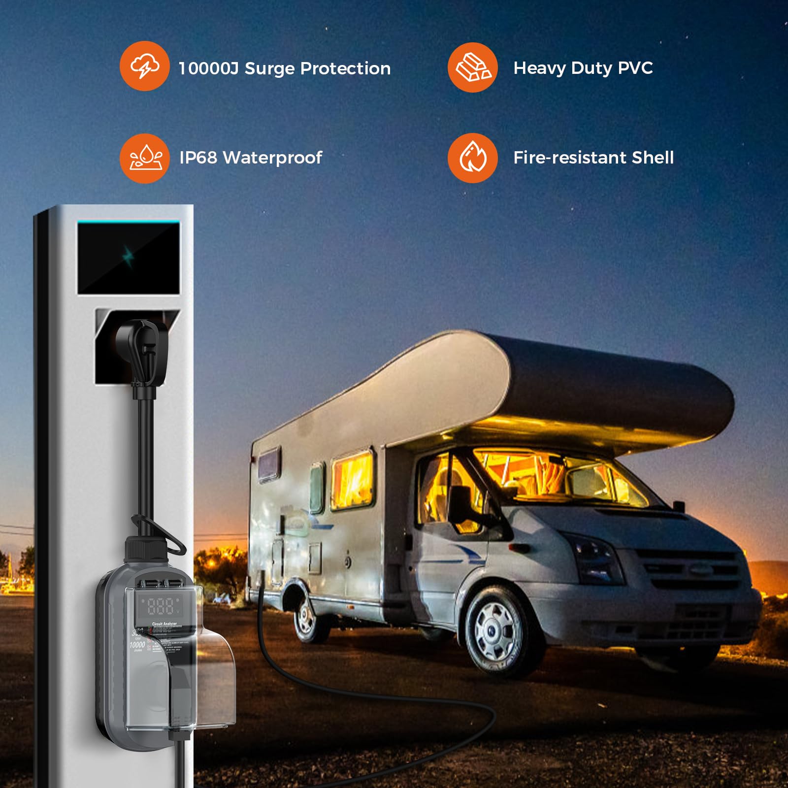 - 【Safety Features】: The camping surge protector is FCC tested, made of V-1 flame-retardant material, with an IP67 waterproof design and protective cover, which is rainproof, windproof, and sandproof.