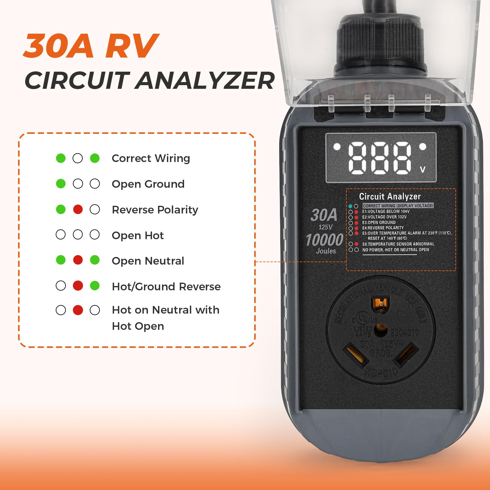 - 【Smart Surge Protector with Digital Display】: This upgraded 30A 10000 Joule RV surge protector can display real-time voltage values, display wiring errors through fault codes "E1-E6", and can quickly and automatically disconnect the power supply.