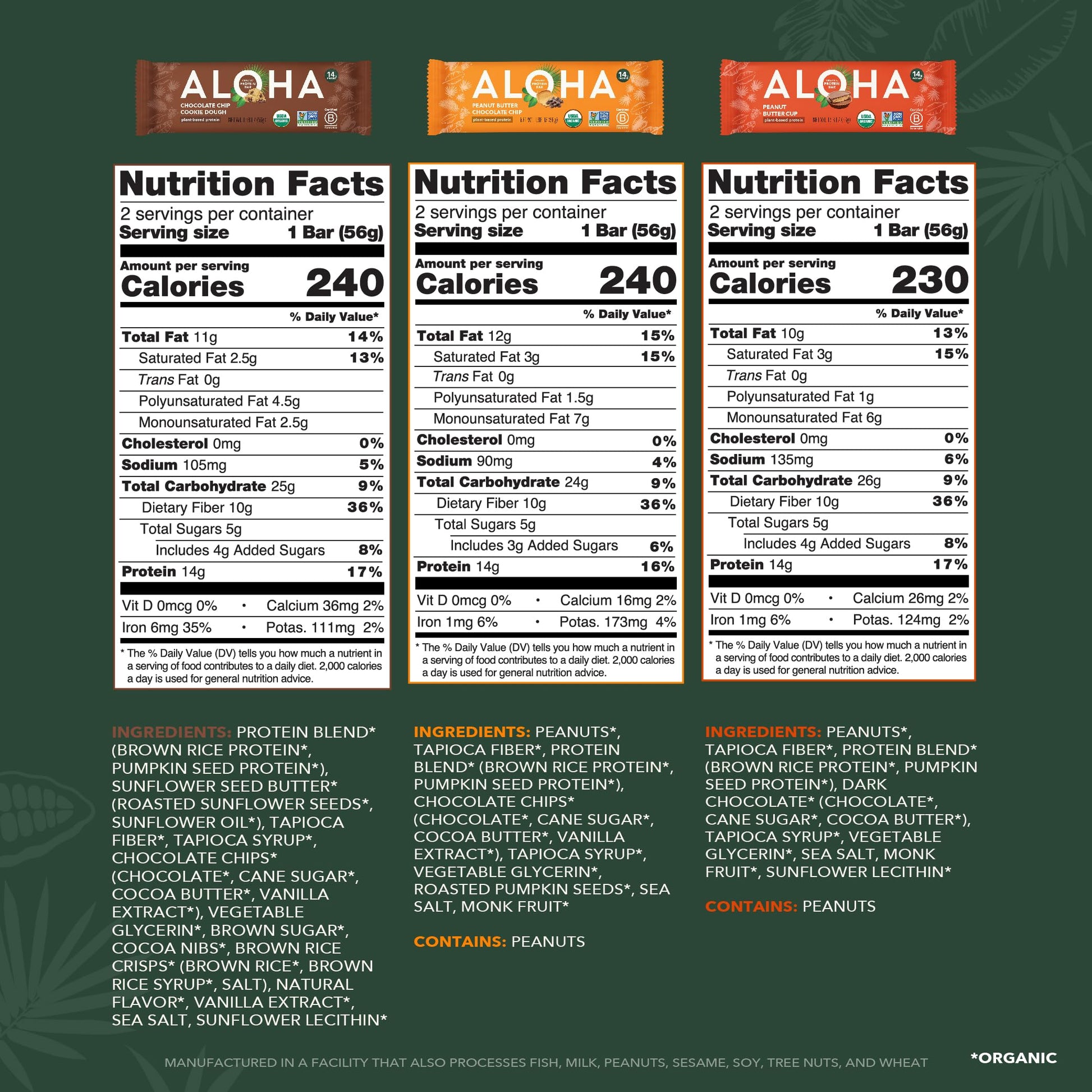 Details: At ALOHA, we believe that plants are the ultimate source of nourishment, and that real foods should be really convenient. So when you’re looking for a great tasting, organic, plant-based protein boost, we’ve got you covered. ALOHA protein bars use simple, organic ingredients that are naturally packed with the tools your body needs to do its best: protein, iron, fiber, and healthy fats. With 14g clean protein and only 4g of natural sugar, ALOHA’s protein bars are the perfect, healthy snack to tide you over. Our thoughtfully selected, plant-based protein is sourced from a balanced mix of organic pumpkin seed and organic brown rice, to deliver steady energy that will carry you through the day without the dreaded sugar crash. ALOHA’s organic, plant-based products are vegan, non-GMO, gluten-free, soy-free, dairy-free (lactose-free), stevia-free, high protein, Kosher Certified and USDA certified organic. ALOHA checks the all the boxes, so you can enjoy a tasty, nutritious snack without hesitation. All of our protein bars and protein products are made free of artificial ingredients and free of sugar alcohols, because we know that what you eat and how you feel are intimately connected. ALOHA organic, plant-based Peanut Butter Chocolate Chip protein bars use a short line of organic, whole-food ingredients that are delicious and self-explanatory: like real, organic chocolate chips, organic peanuts, organic roasted pumpkin seeds, of sea salt. The perfect protein bar for when you’re between meetings, warming up for the gym (or cooling down!), on the road, taking a pit-stop on your weekend cycle, or looking for an easy, nutritious option at home. The search for a healthy, satisfying, go-to snack is over: sit back and enjoy a great tasting, rejuvenating ALOHA protein bar.