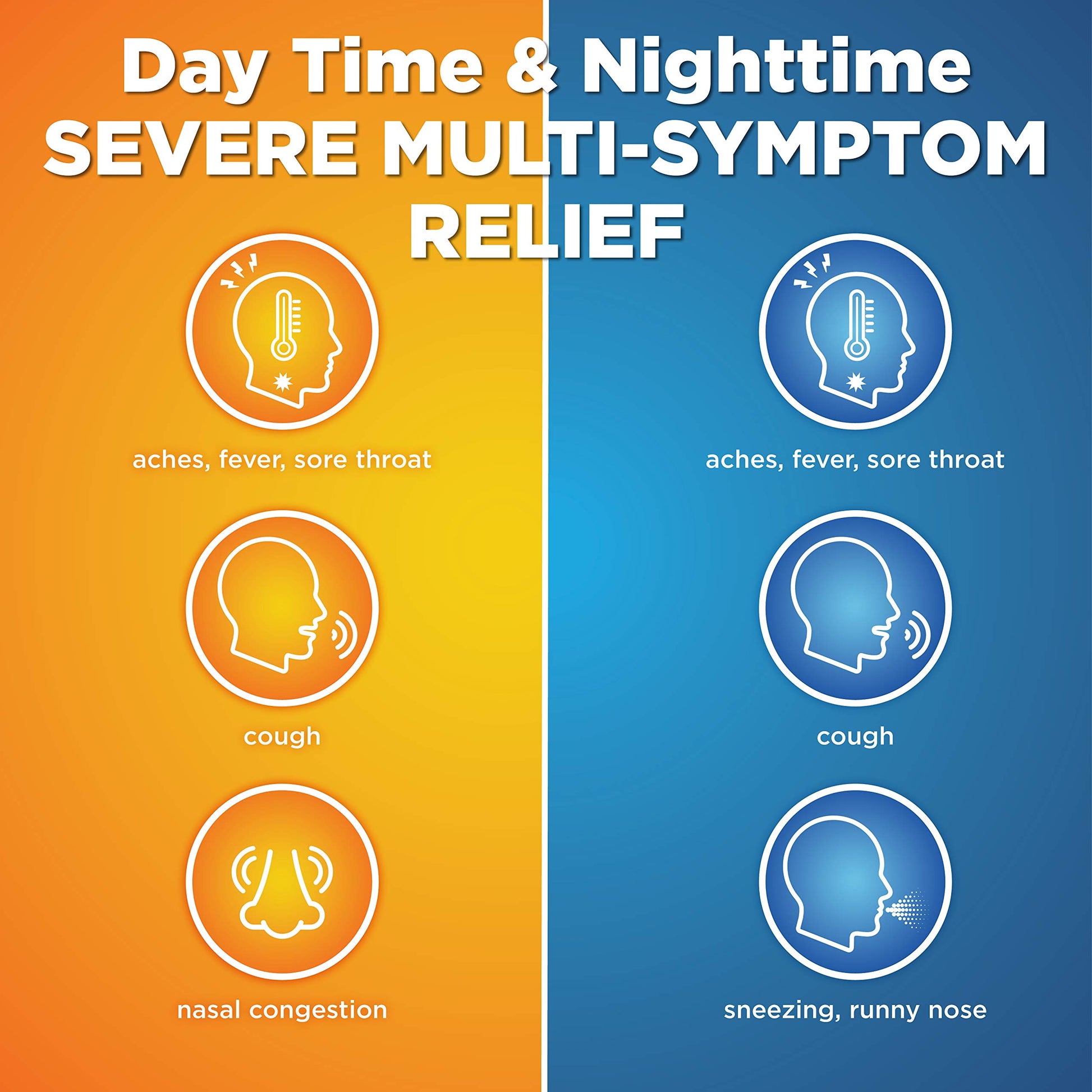 - MAXIMUM STRENGTH: Get day and night cold and flu relief with these max strength coated caplets. Relieve sore throat and other cold and flu symptoms with Amazon Basic Care Vapor Ice Daytime and Nighttime Severe Cold and Flu