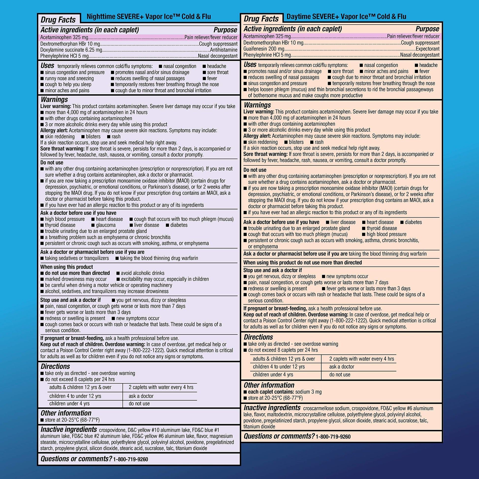 Details: Compare to Vicks DayQuil and NyQuil Severe VapoCOOL active ingredients. Combat cold and flu symptoms with Amazon Basic Care Vapor Ice Daytime and Nighttime Severe Cold and Flu, Coated Caplets. This combo pack gives you around-the-clock, maximum strength relief of multiple cold and flu symptoms. Non-drowsy Daytime relieves minor aches and pains, fever, nasal congestion, sinus pressure, cough and chest congestion. Nighttime relieves minor aches and pains, fever, nasal congestion, sinus pressure, sneezing, runny nose and cough. Take these gluten free caplets for multi-symptom severe cold and flu relief. This product is for adults and children 12 years and over.