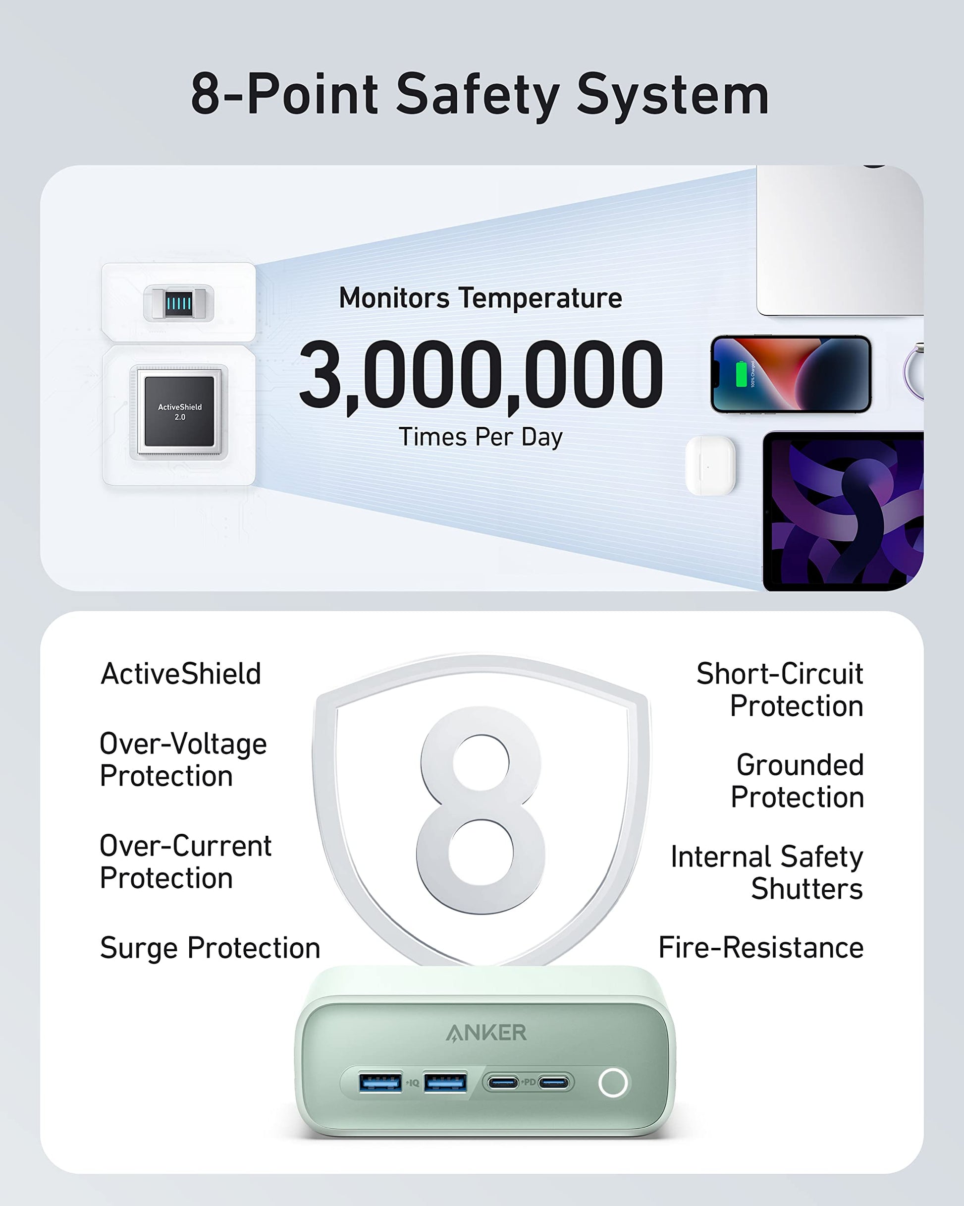 • Advanced Device Protection: ActiveShield 2.0 ensures safety with real-time temperature control and adaptive power management in the Anker 525 Charging Station.