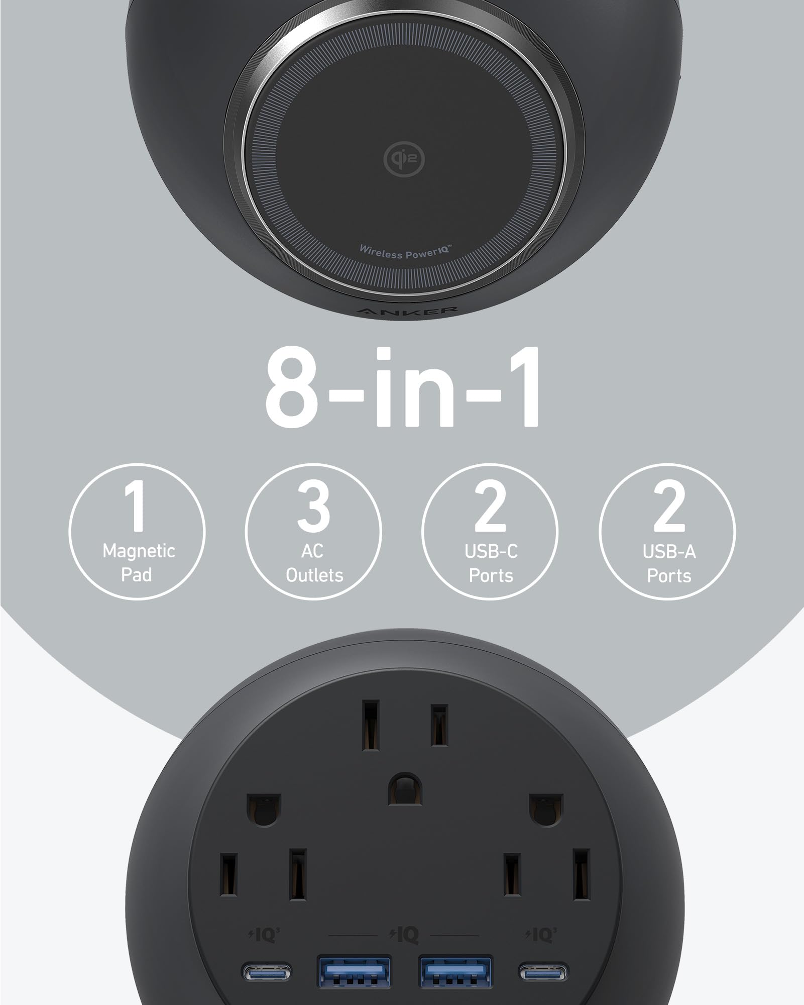 Anker MagGo Magnetic Charging Station, Qi2 Certified 15W Ultra-Fast MagSafe Wireless Charger for iPhone 15/14/13, 8-in-1 Power Strip with 3 AC and 4 USB Desktop Charger for MacBook and More