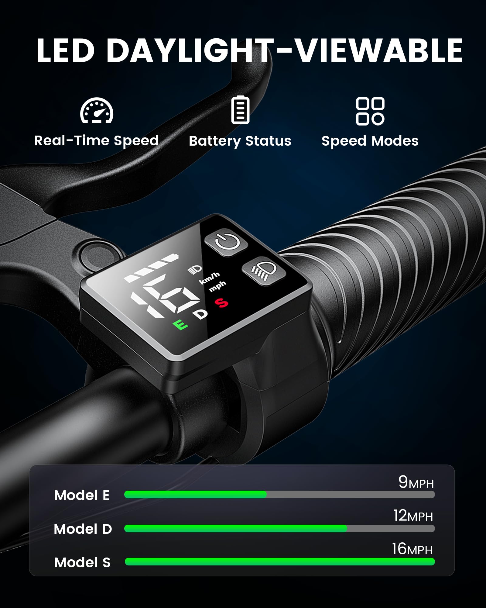 - 【Foldable Design with Smart LCD Display】 Keep track of your ride using the LCD display showing speed, mode, and battery level. The adjustable padded seat fits riders from 5’1”–6’1”, suitable for teens, adults, or seniors. Its foldable frame makes it easy to store in your car trunk, home, or office, ideal for daily commuters.