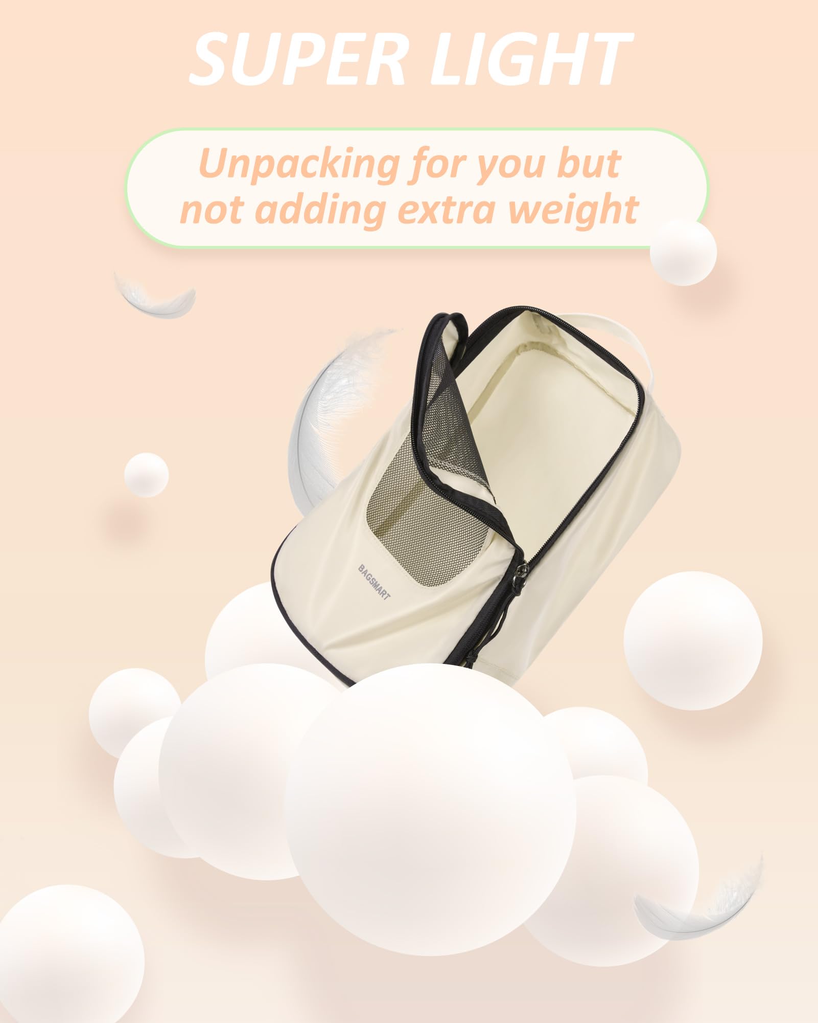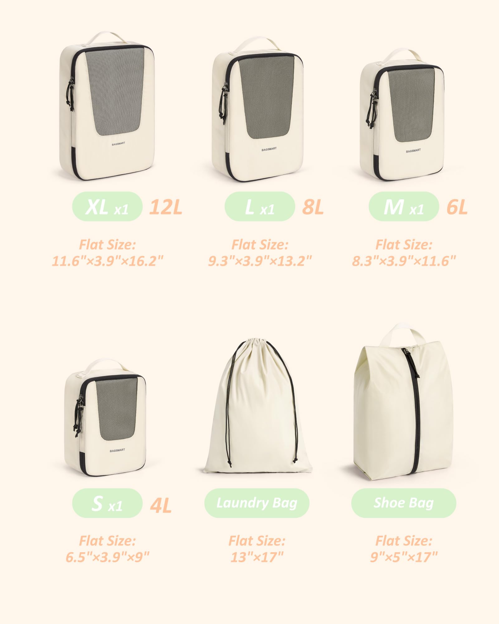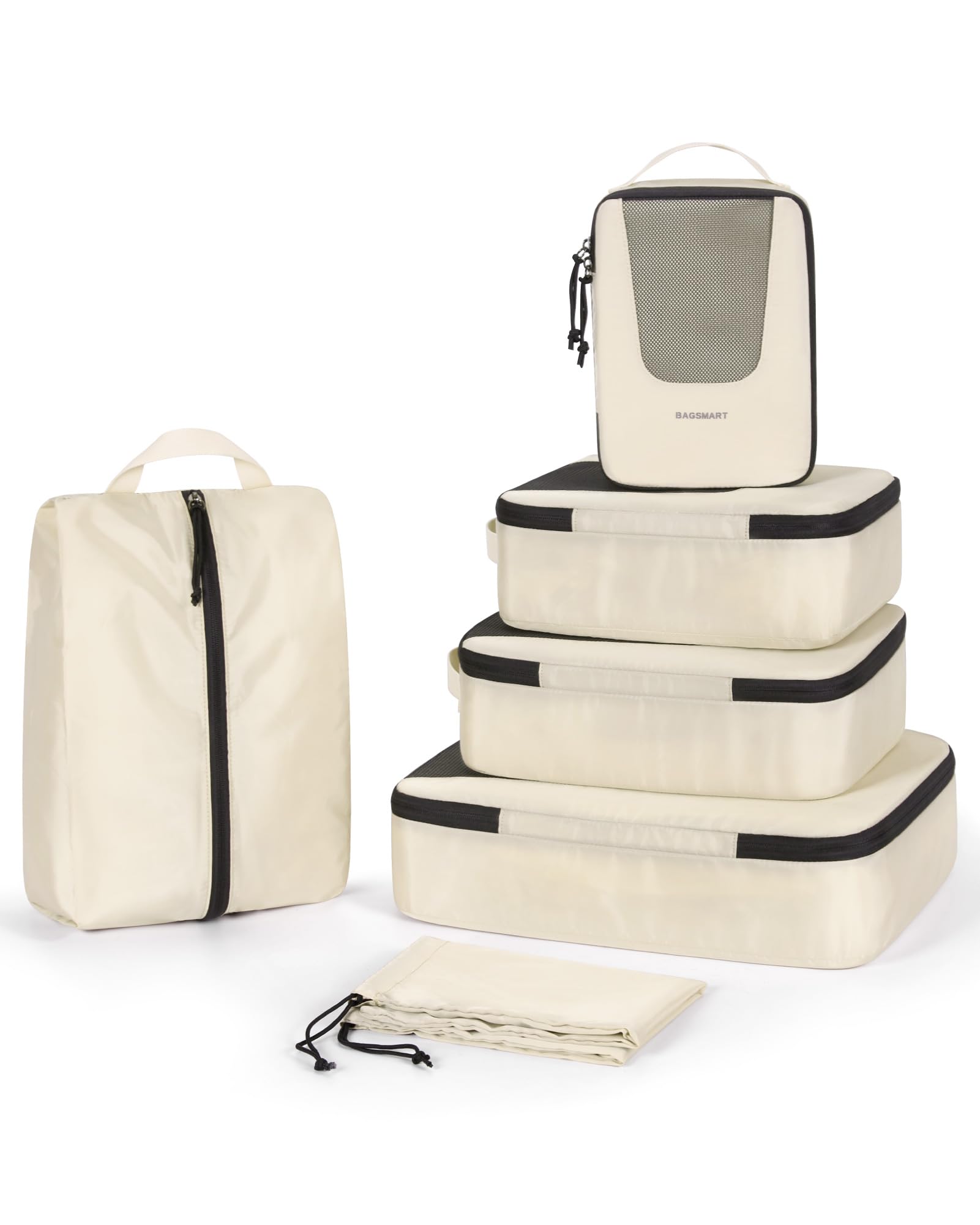 - Packing Cubes - Are you fed up with the travel kind of messy suitcase? Travel with BAGSMART PACKING CUBES and they make a world of difference. The 6-piece packing cubes contains 4 travel cubes + 1 laundry bag + 1 shoe bag, keeps your outfits in separate packing bags, and makes your luggage clean and neat while traveling