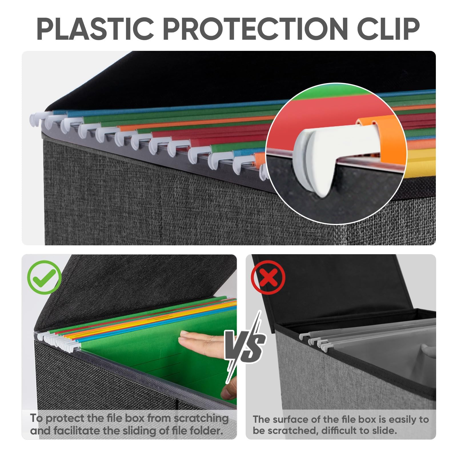 - [UNIVERSAL SIZE] Our file box with lid fits letter-sized files. It is designed for efficiency and functionality, with its smooth PVC slide rails on both sides, you can effortlessly slide file folders for easy access and neatly arranged. The lid fits snugly on the box after hanging folders. (NOTE: file folders are not included)