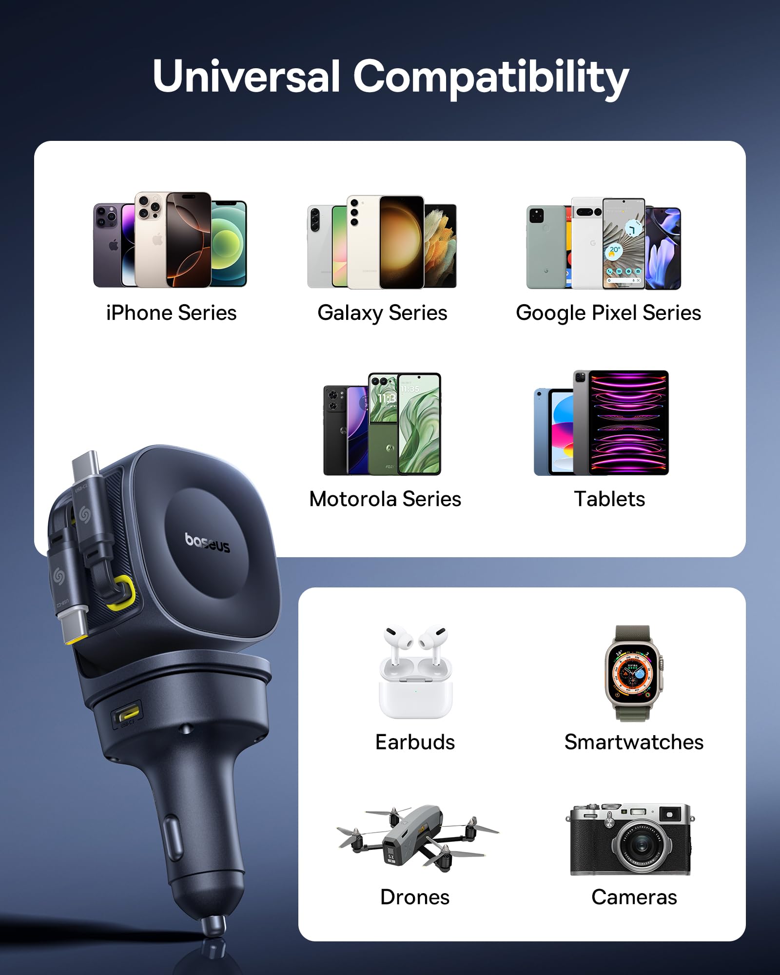 - Built-in Dual 31.5-Inch Retractable Cables: Say goodbye to cable clutter with Baseus retractable car charger. This car fast charger integrates two built-in retractable USB-C cables with secure magnetic storage, always keeping your car interior neat and organized whether in use or after used. The dual cables are tested to endure over 10,000 smooth pulls and retractions, built to last and accompany your every journey with reliability and peace of mind