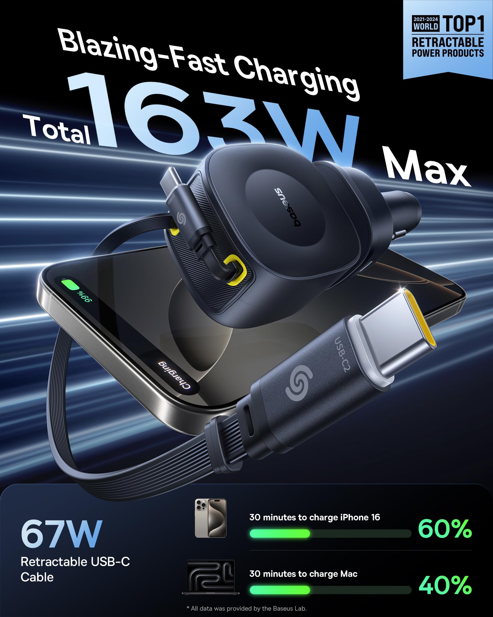 - 163W Retractable Car Charger: Experience lightning-fast charging for seamless office work on the go. Designed to support high-power devices such as laptops, tablets, and smartphones, this fast charging car charger ensures your road trips and daily commutes hassle-free. It includes a 67W USB-C1 cable output, a 33W USB-C2 cable output, a 33W USB-C3 port output and a 30W USB-A port output, a total of 163W