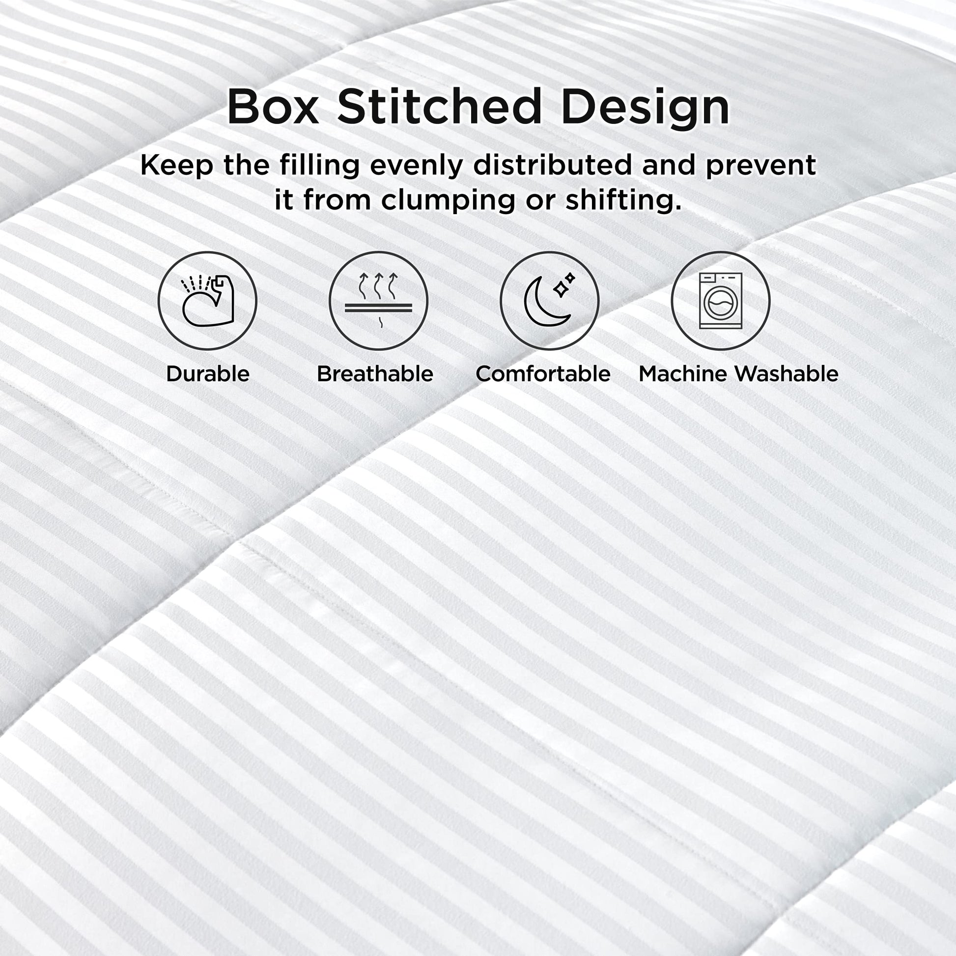 - Careful Design: This down alternative comforter features the classic box Stitched design to keep the filling evenly distributed and prevent it from clumping or shifting. The 8 corner tabs make it easy to attach a duvet cover and keep the comforter in place