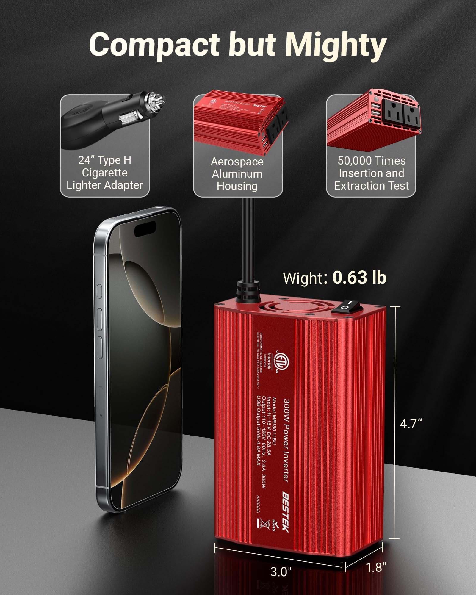 - Durable Aerospace Aluminum Housing: Bestek car inverter provides advanced protection from drops and bumps.Smart cooling fan system makes the car power inverter very silent when operating,and the fan runs faster when the device gets warmer or output power exceeds 70W