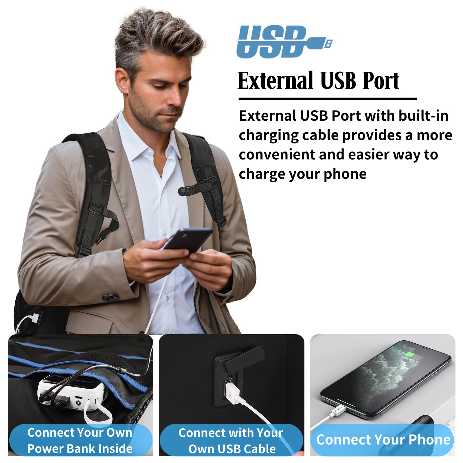 - ▶ USB Charging Port Design: The laptop bag comes with a charging port you can link your phone to and easily charge during outdoors and travel. Place your power bank inside the bag and connect your phone to the outer port (built-in charging cable inside). Please note that this bag doesn't power itself, usb charging port only provides easy access to charge.
