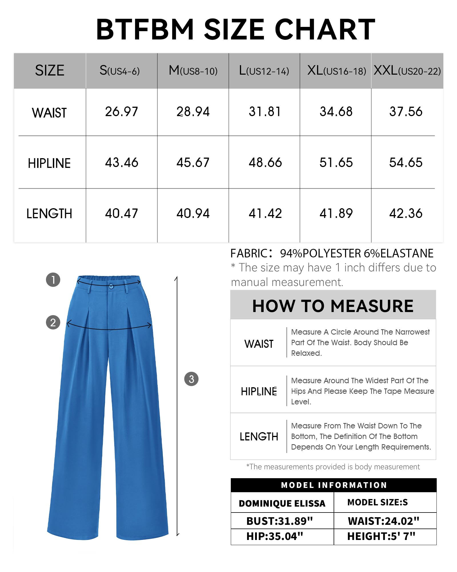 • FEATURES: S=US 4-6, M=US 8-10, L=US 12-14, XL=US 16-18, XXL=US 20 / Casual Wide Leg Suits Pants / High Waist / Elastic Waist In The Back / Pleated Front / 2 Side Pockets / Button And Zipper Closure / Wide Leg / Loose Fit