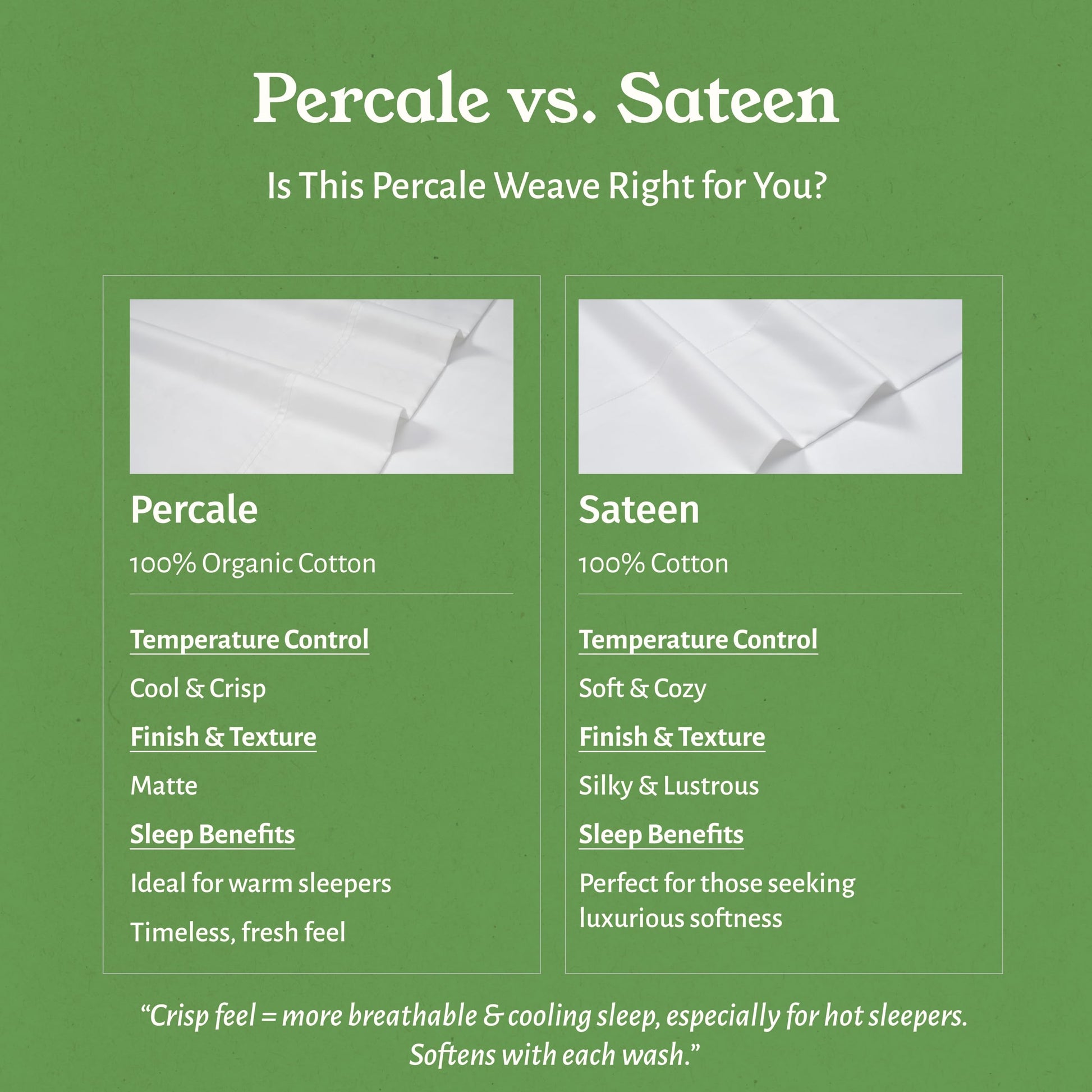 - 1 PIECE 100% ORGANIC COTTON FITTED SHEET - LIGHTWEIGHT, CRISP & COOLING PERCALE: Made from organically grown cotton, our soft, crisp and comfortable fitted sheets pass numerous quality checks for its authenticity. Percale sheets are breathable, naturally crisp with a matte finish (unlike shiny sateen), ideal for hot sleepers, and soften beautifully with each wash. 1 Queen Fitted Sheet Only - 60" W x 80" L + 15" deep pockets, fully elasticized.