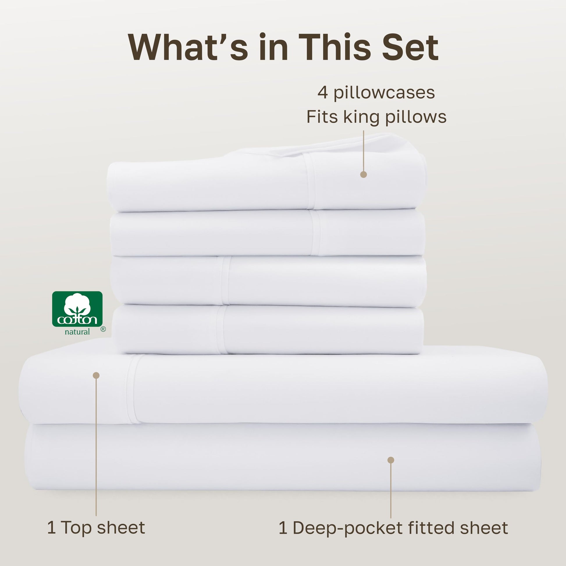 California Design Den 6 Pc King Size Sheet Set with 4 Pillowcases - Soft 400 Thread Count 100% Cotton Sheets, Sateen, Deep Pockets with All Around Elastic, Durable Bedding Set - White