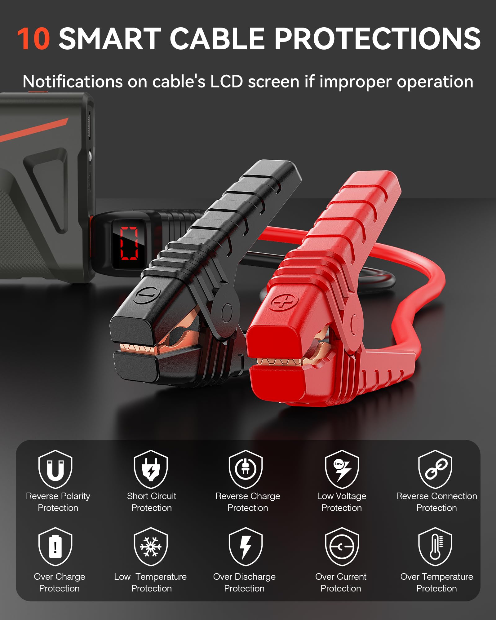 - 【10 Advanced Protections】Safety jumper cables can reach varied battery terminals. Its high quality, and gilded intelligent jumper clamps built-in 10 safe protection, no need to worry about incorrect connections or sparks. It's also designed an LCD screen on the smart jumper clam, it will auto detect connection and real-time notifies incorrect operations on the smart display, protect your vehicle