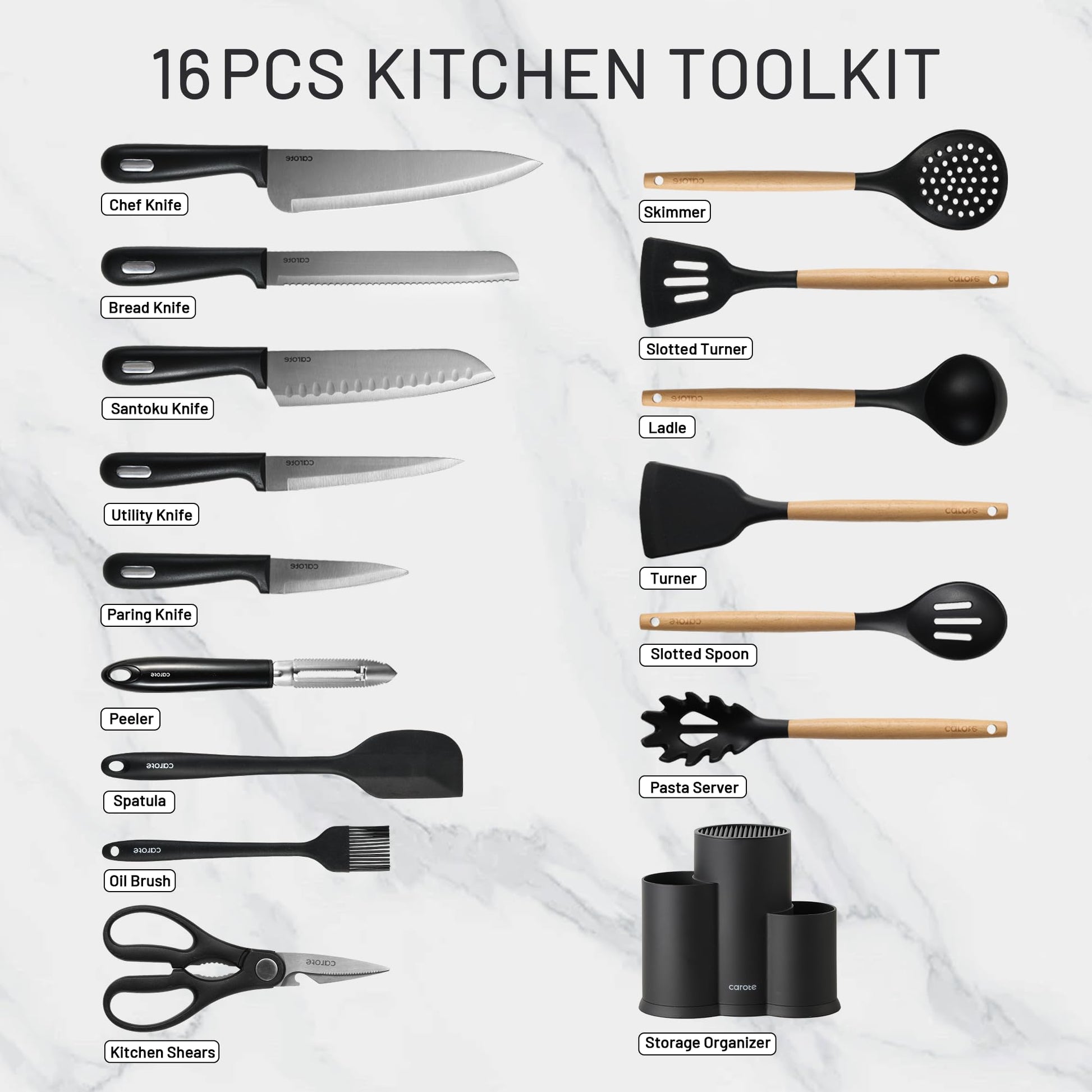 CAROTE 16 Pieces Kitchen Utensils Set, Silicone Cooking Utensils Set with Wooden Handle, Stainless Steel Knife Set with Block, Kitchen Utensil Gadgets Cutlery with Anti-slip Handle, Black