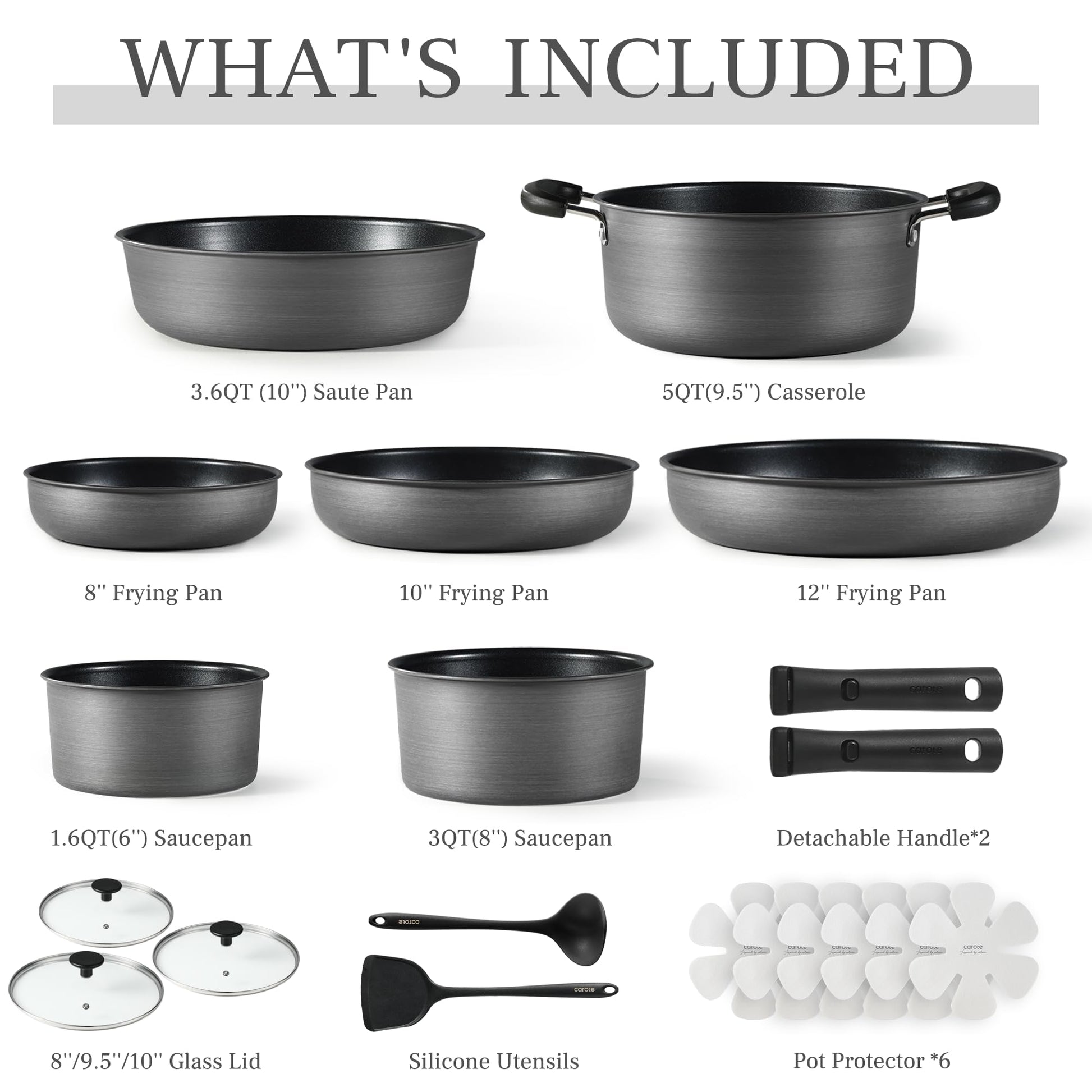 CAROTE 20pcs 4-Ply Premium Hard Anodized Pots and Pans Set Non Stick with Detachable Handle, Dishwasher/Oven Safe, RV Kitchen Cookware Set Nonstick, Induction Cookware, Large Capacity Pans and Pot Set