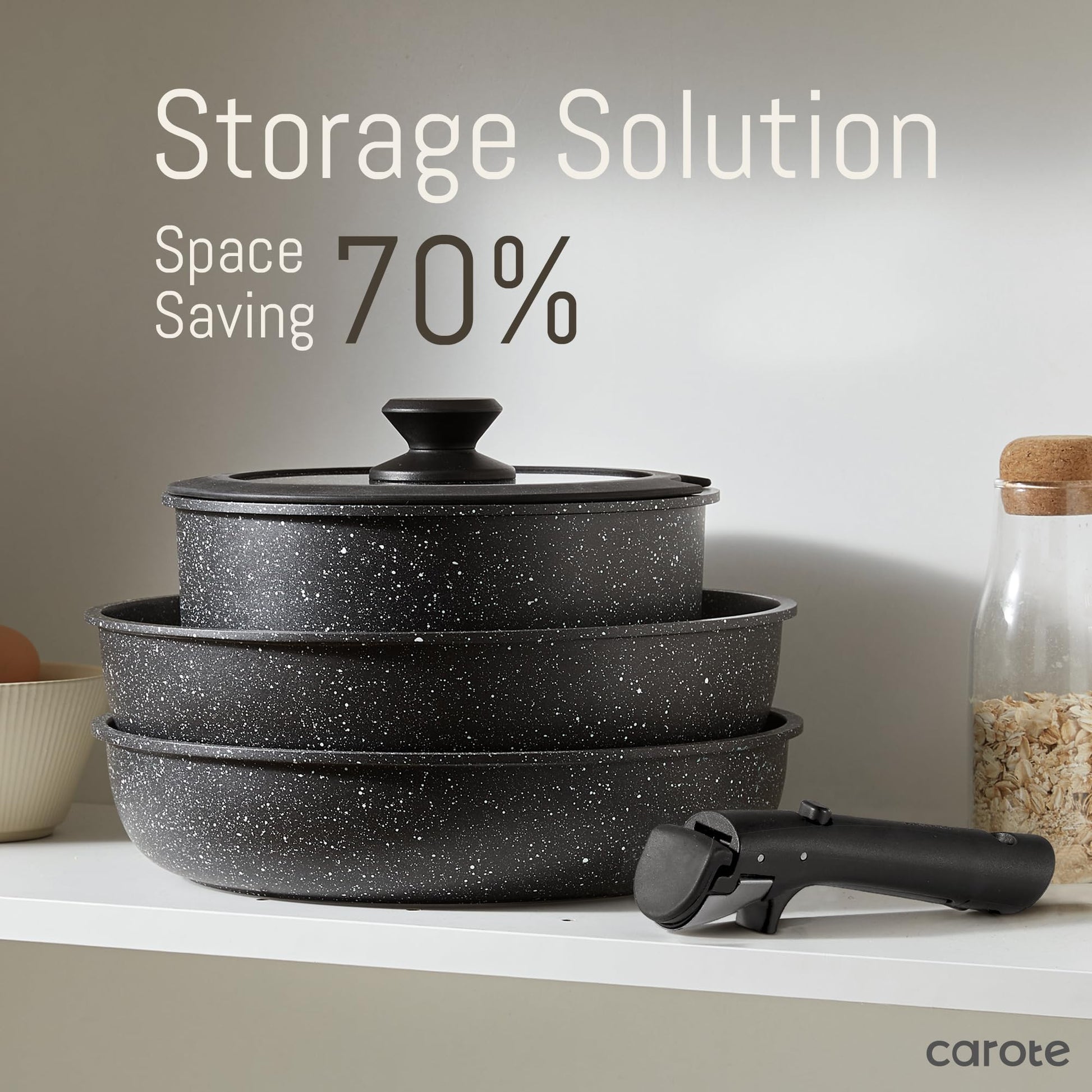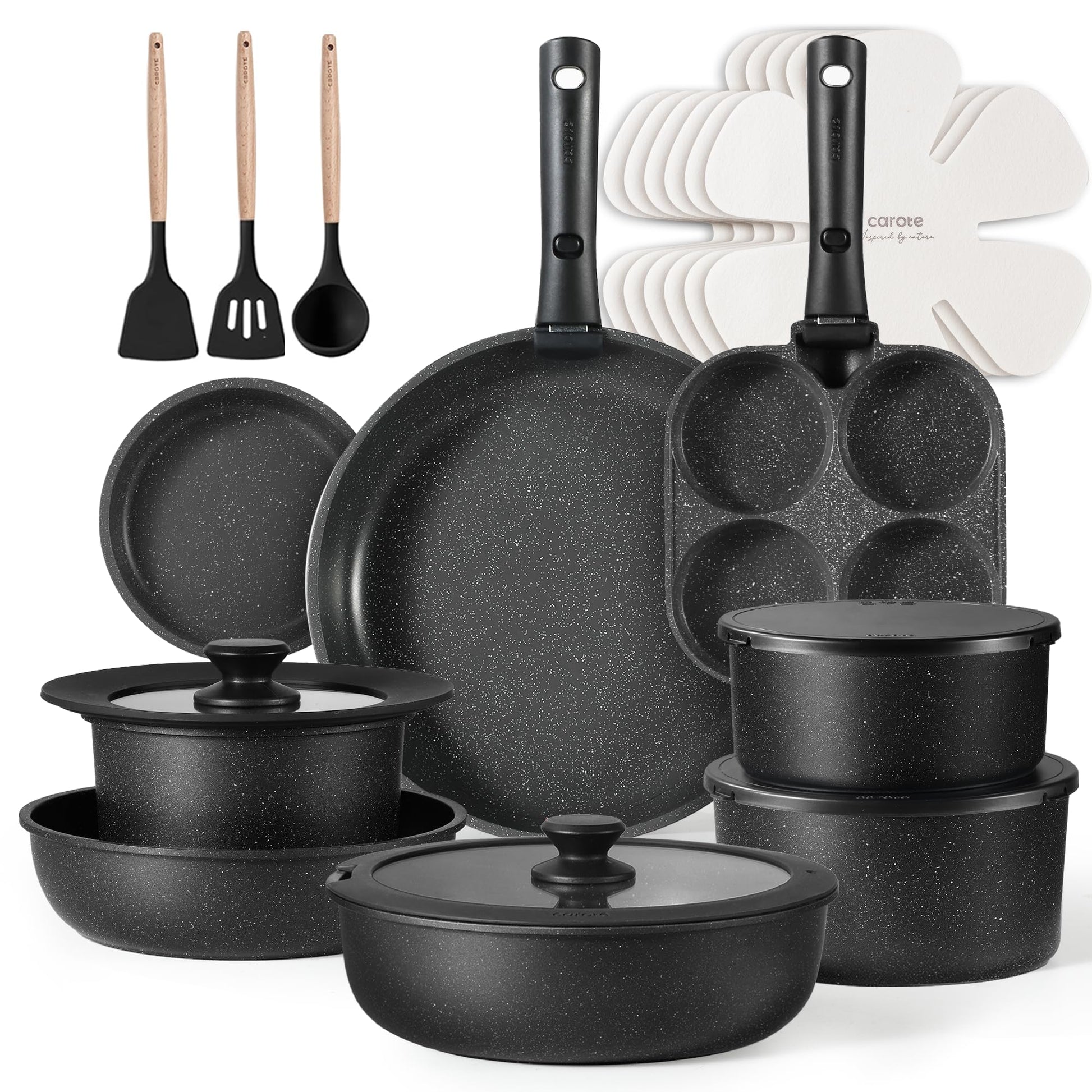 CAROTE 23pcs Pots and Pans Set Non Stick, Cookware Sets, Kitchen Set, Oven/Dishwasher/Fridge Safe, Space Saving Pots Set, Nonstick Set with Versatile Detachable Handle, Induction RV Set, Black