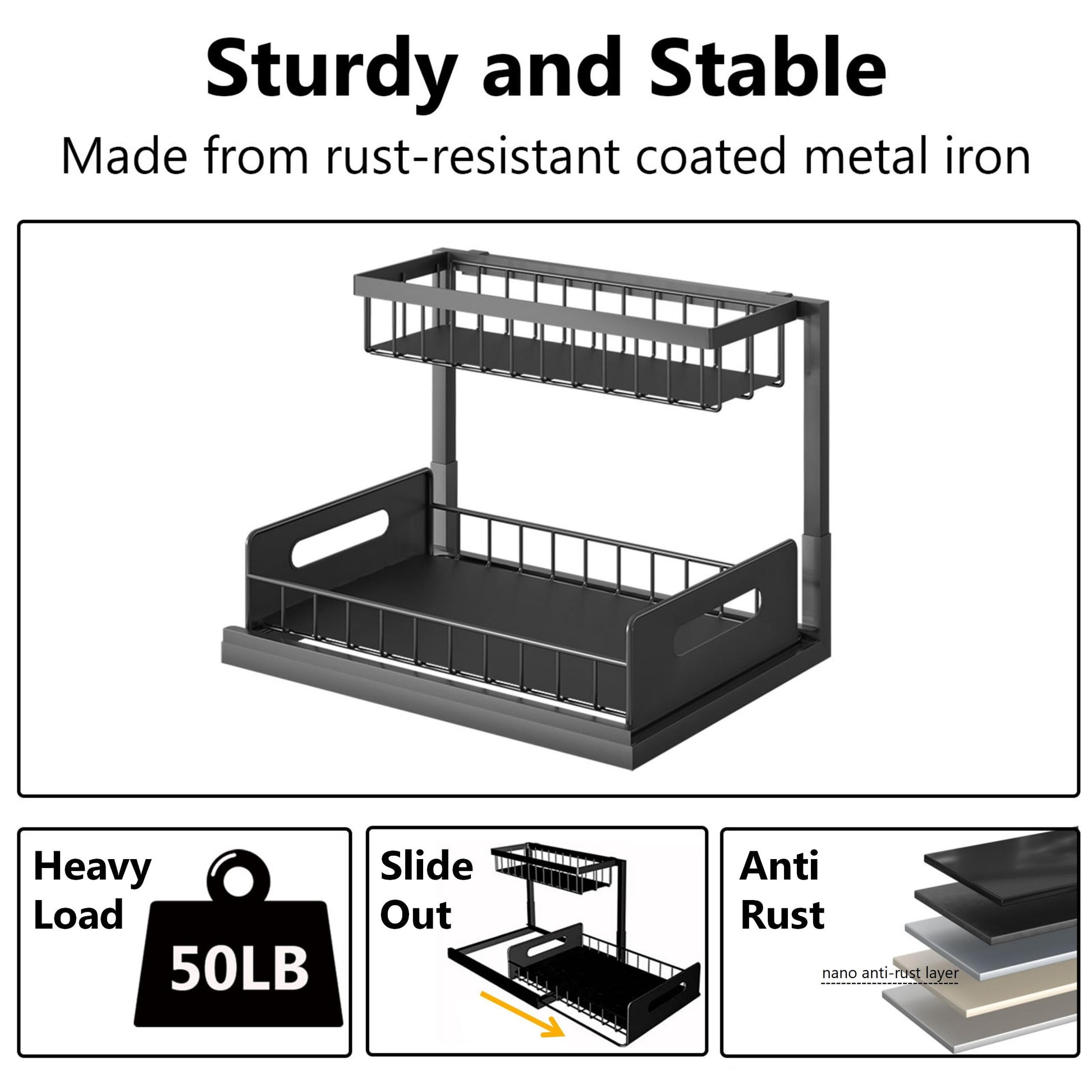 • Sturdy and Stable: Made from rust-resistant coated metal iron, the under cabinet storage did not rock about or jam when you pulled out the bottom drawer