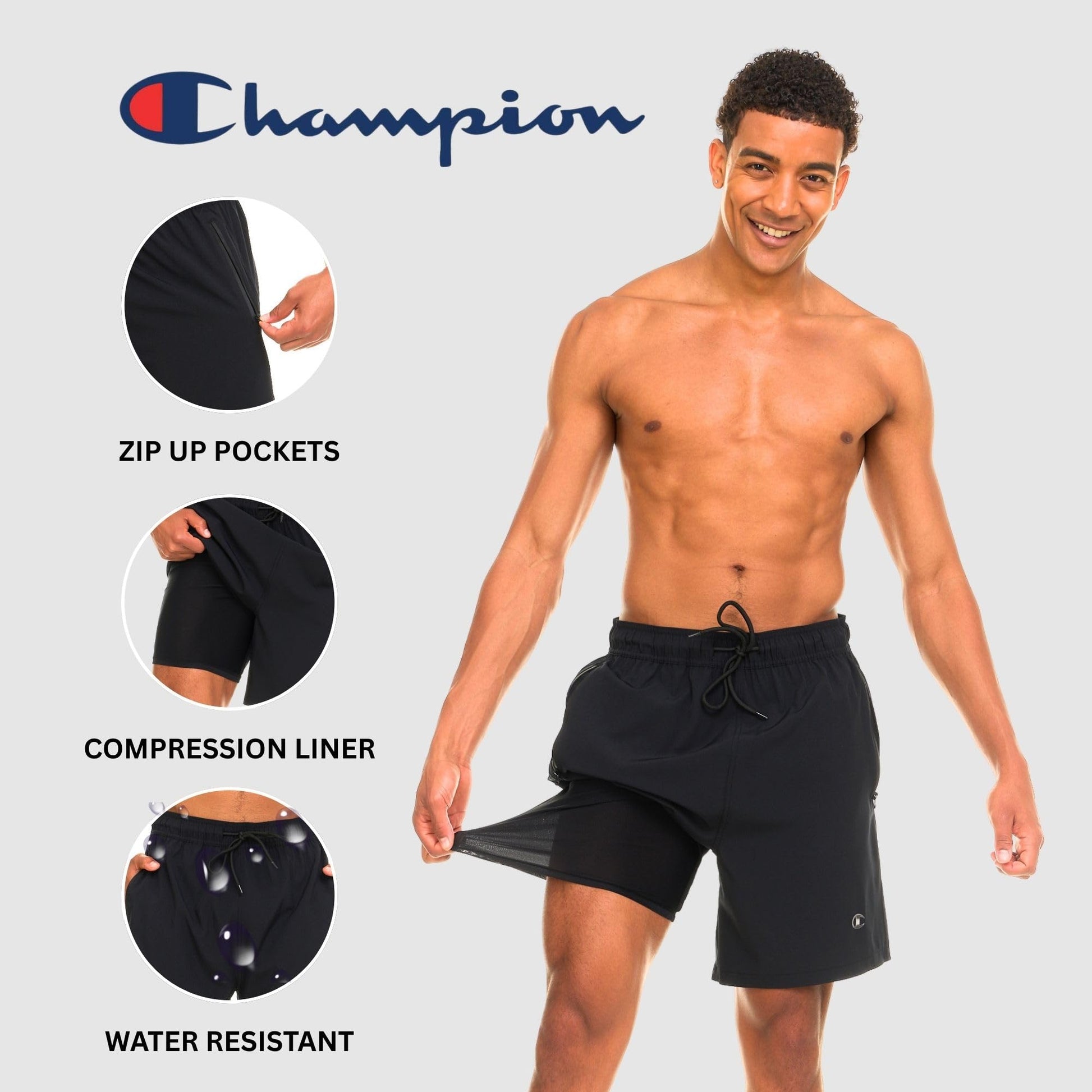 Champion Mens Swim Trunks with Compression Liner, 2 in 1 Mens Bathing Suit Shorts, 7 Inch Inseam Board Shorts for Swimming Black