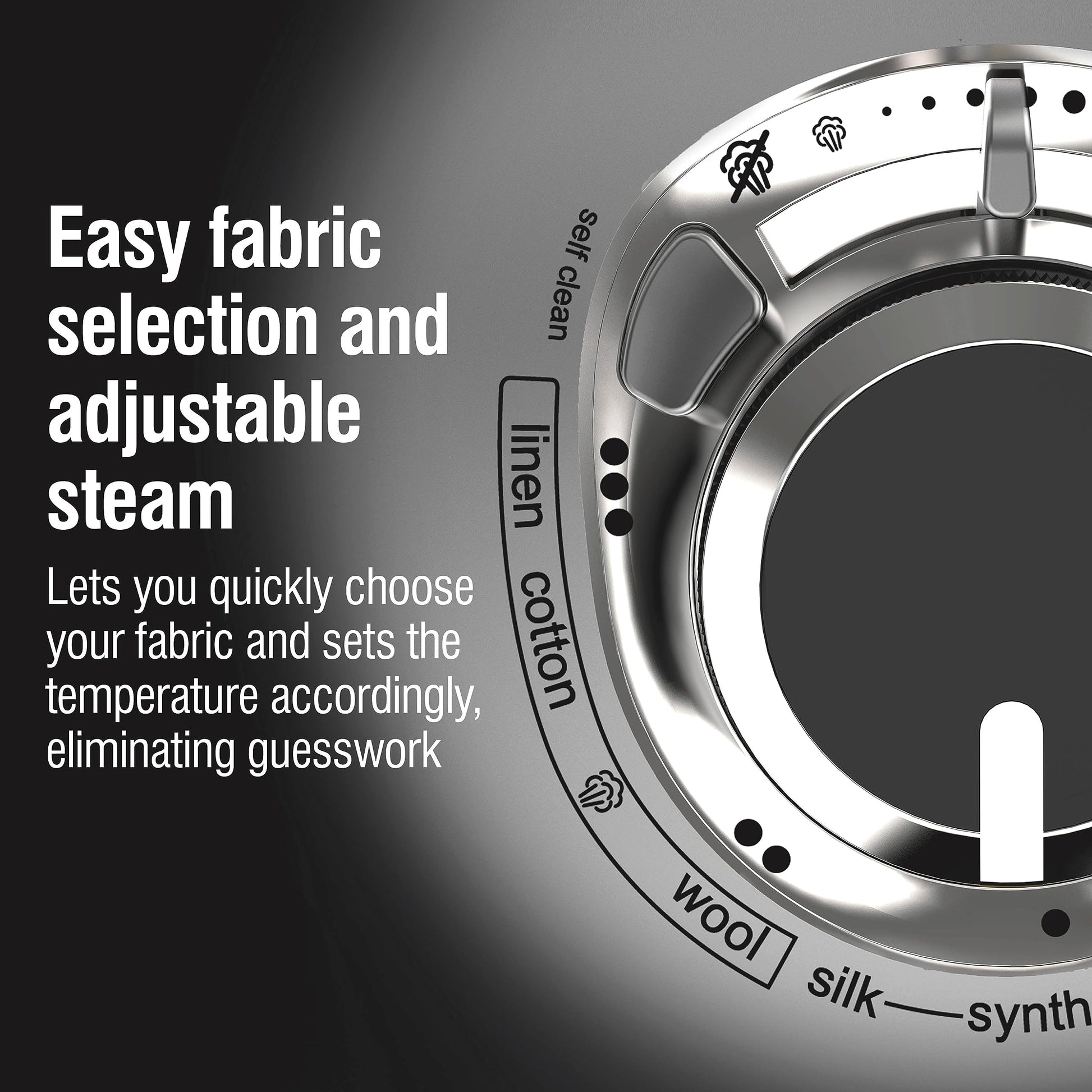 - EASY FABRIC SELECTION AND ADJUSTABLE STEAM: The temperature control dial lets you quickly choose your fabric and sets the temperature accordingly, eliminating guesswork. The adjustable steam lever goes from no steam to full power with just a quick slide.