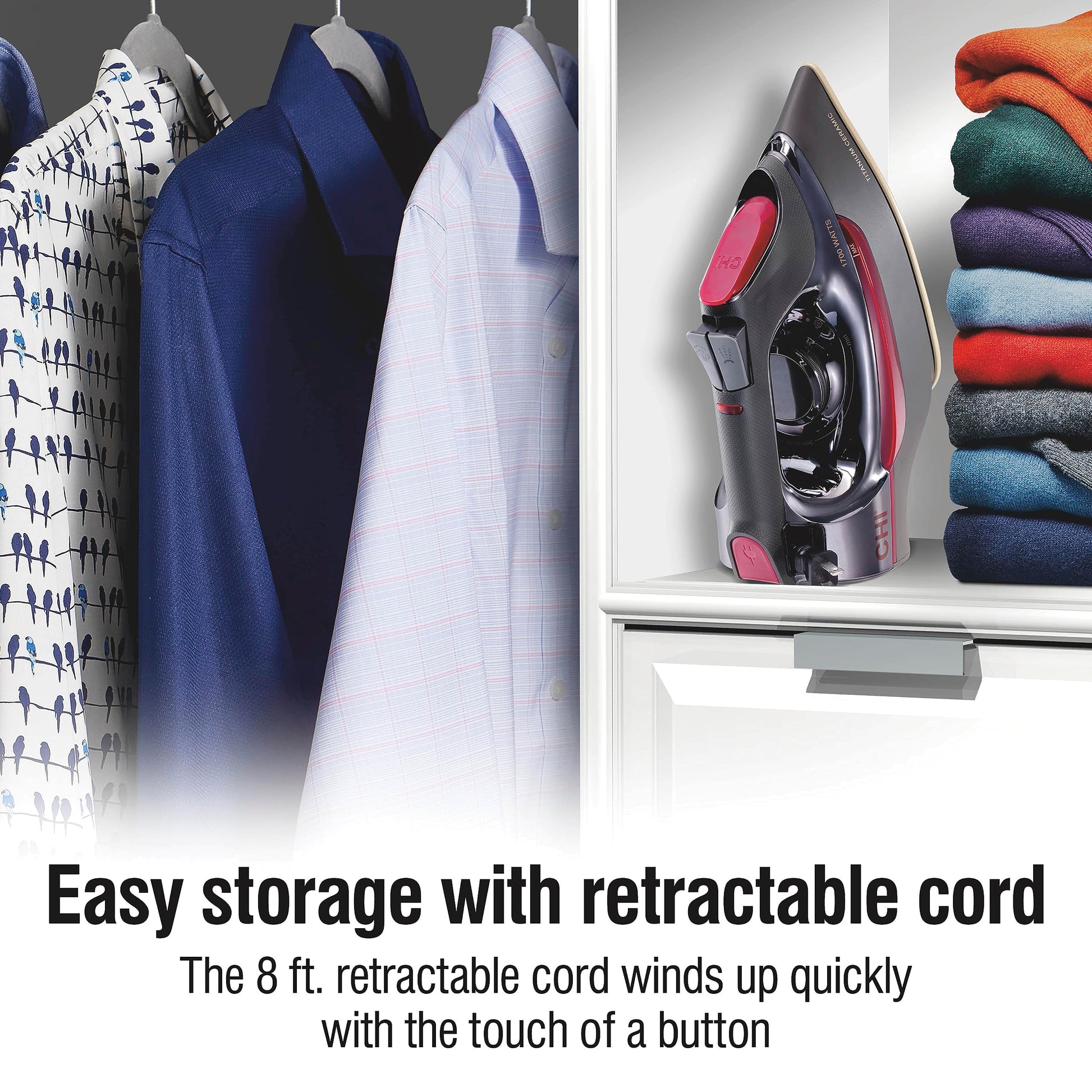 Details: Whether your definition of a polished look is a well-pressed suit, a smooth silk dress or a wrinkle-free shirt for work, you can achieve it with the Chi retractable cord iron. Like our haircare tools, This iron is designed to give you the high-performance power of the pros at home.