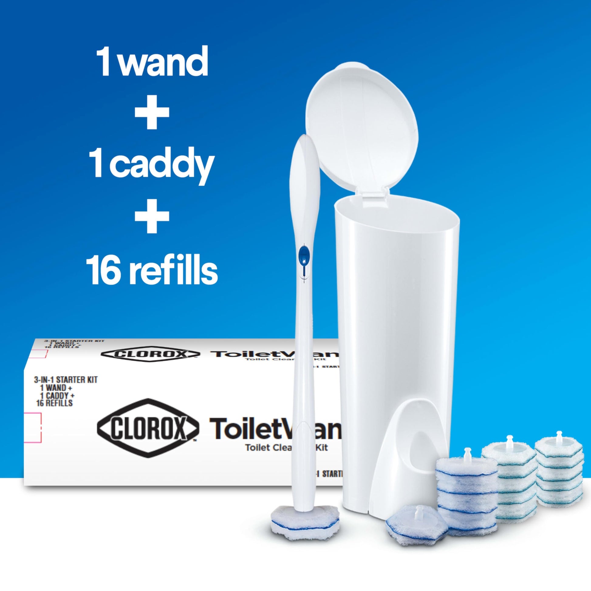 - WAND AND CADDY: Clorox ToiletWand comes with a long handle to help you clean from a distance, and a caddy to conveniently store scrubbing pad refills