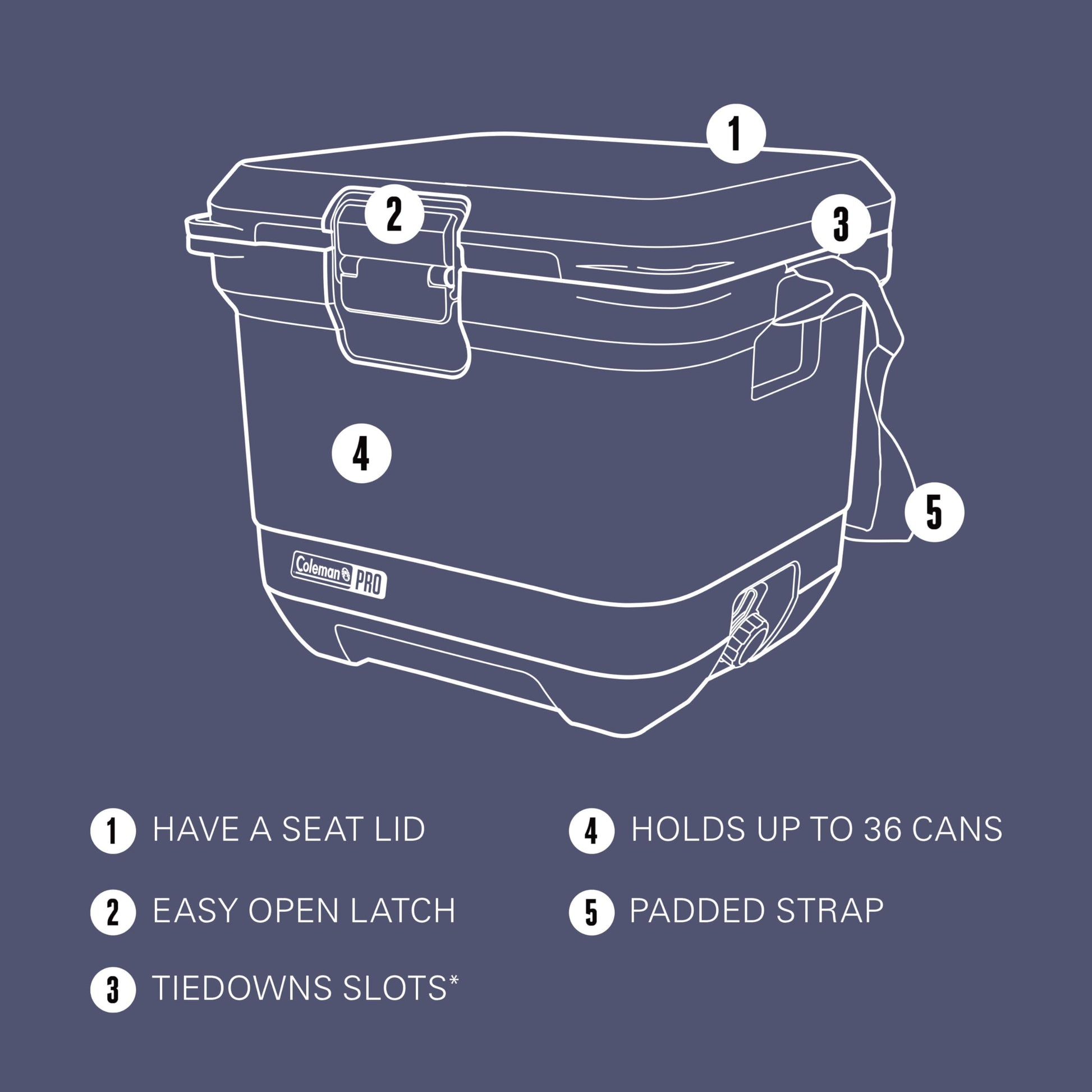 Details: You work hard for your time off. You deserve gear that goes above and beyond. Meet the Coleman Pro series, designed for those who expect more. This 25-quart hard cooler stays cold for up to 3 days thanks to a fully insulated lid and body featuring extra thick walls up to 2 inches wide. Use its padded carrying strap to comfortably trek from backyard to beach to tailgate to sidelines, while the stainless steel latch allows you to open and close the cooler with one hand. Extra-wide drain plug is attached so you can drain fast without losing track of the plug. Tie-down straps and non-slip feet let you securely rig your cooler in the bed of your truck or in the D-rings of your raft, while a pad-lock opening lets you add extra security. The Have-A-Seat lid is built to accommodate an extra guest when you run out of seats around the campfire, at the game, or out back. Best of all, these built-to-last features are backed by our 10-year limited warranty, so you can confidently bank on Pro performance for all your trips to come.