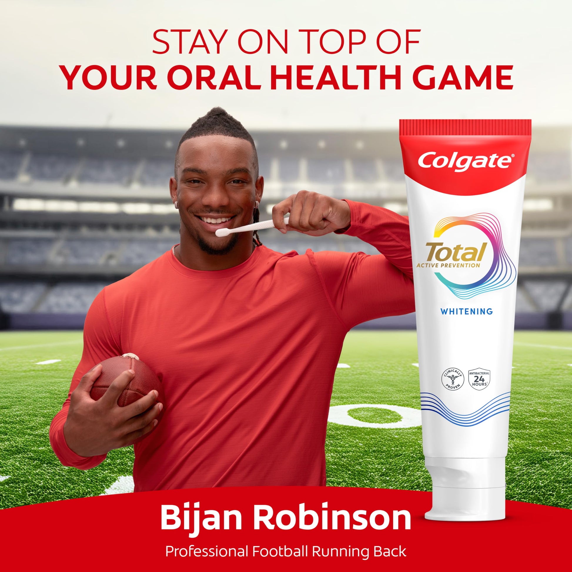 Details: Upgrade your family’s oral care routine with the Colgate Total Whitening Toothpaste, now available in a 5.1 oz, 4 pack for lasting convenience. Designed for prevention, this Colgate Total Whitening Fluoride Toothpaste pack helps stop oral care problems like gingivitis and cavities before they start. The advanced whitening toothpaste with fluoride contains a unique system that stabilizes our active ingredient for superior performance* to help prevent common oral care issues. Colgate Total Toothpaste is clinically proven to target bacteria, the root cause of common oral health issues. Provides 24-hour antibacterial protection***. Fights root cause**** of gingivitis, plaque, tartar, cavities, sensitivity, bad breath, enamel erosion, and stains, while also whitening teeth. Colgate Total is clinically proven to provide healthier gums^ for better oral hygiene and lasting benefits. *vs. non-antibacterial fluoride toothpaste. Oral care problems include cavities, gingivitis, tartar, bad breath, sensitivity, and plaque buildup. **Clinically proven to target the root cause of common oral health issues via bacteria reduction, including gingivitis and cavities with twice-daily brushing. ***With twice-daily brushing for four weeks of continued use. ****Via protection against bacteria and dietary exposures, with daily brushing. ^vs. non-antibacterial fluoride toothpaste with three months of continued use.
