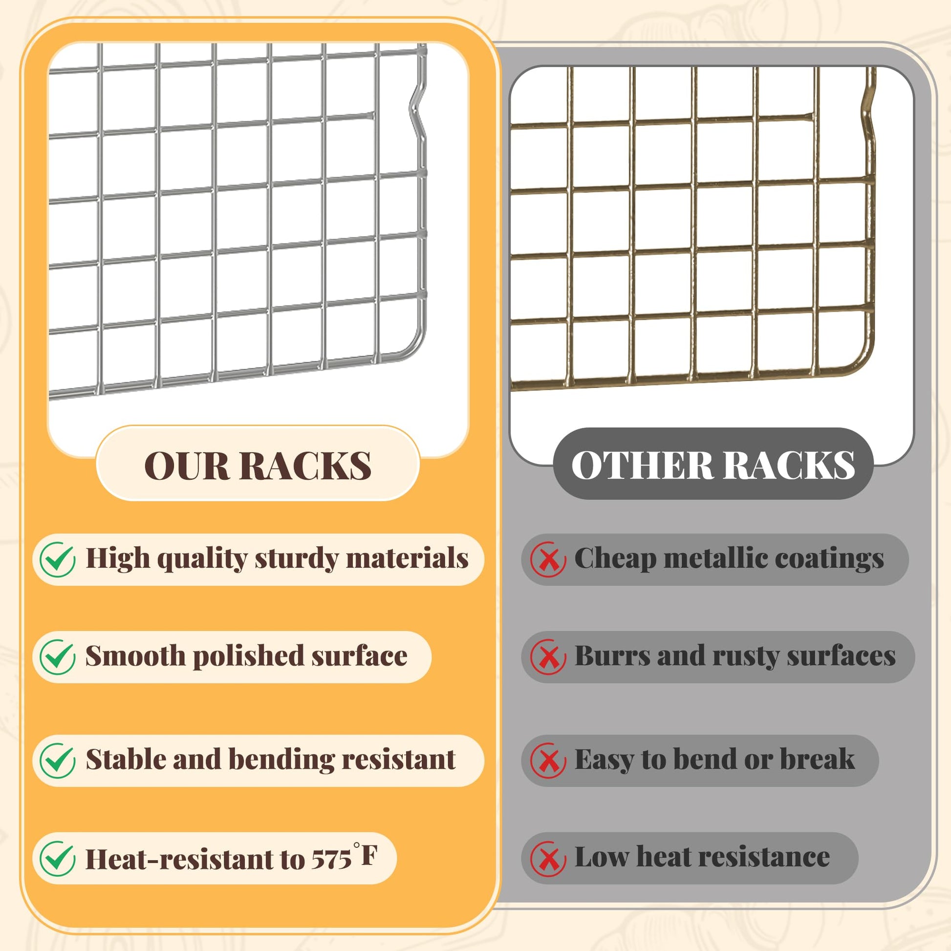 - STURDY STAINLESS STEEL CONSTRUCTION: Our baking cooling rack is made of quality materials, prevents bending or deformation when carrying heavy loads. Smooth polished surface of cookie cooling rack without coating or plating, no burrs, no rust, no peeling, protect your daily food safety
