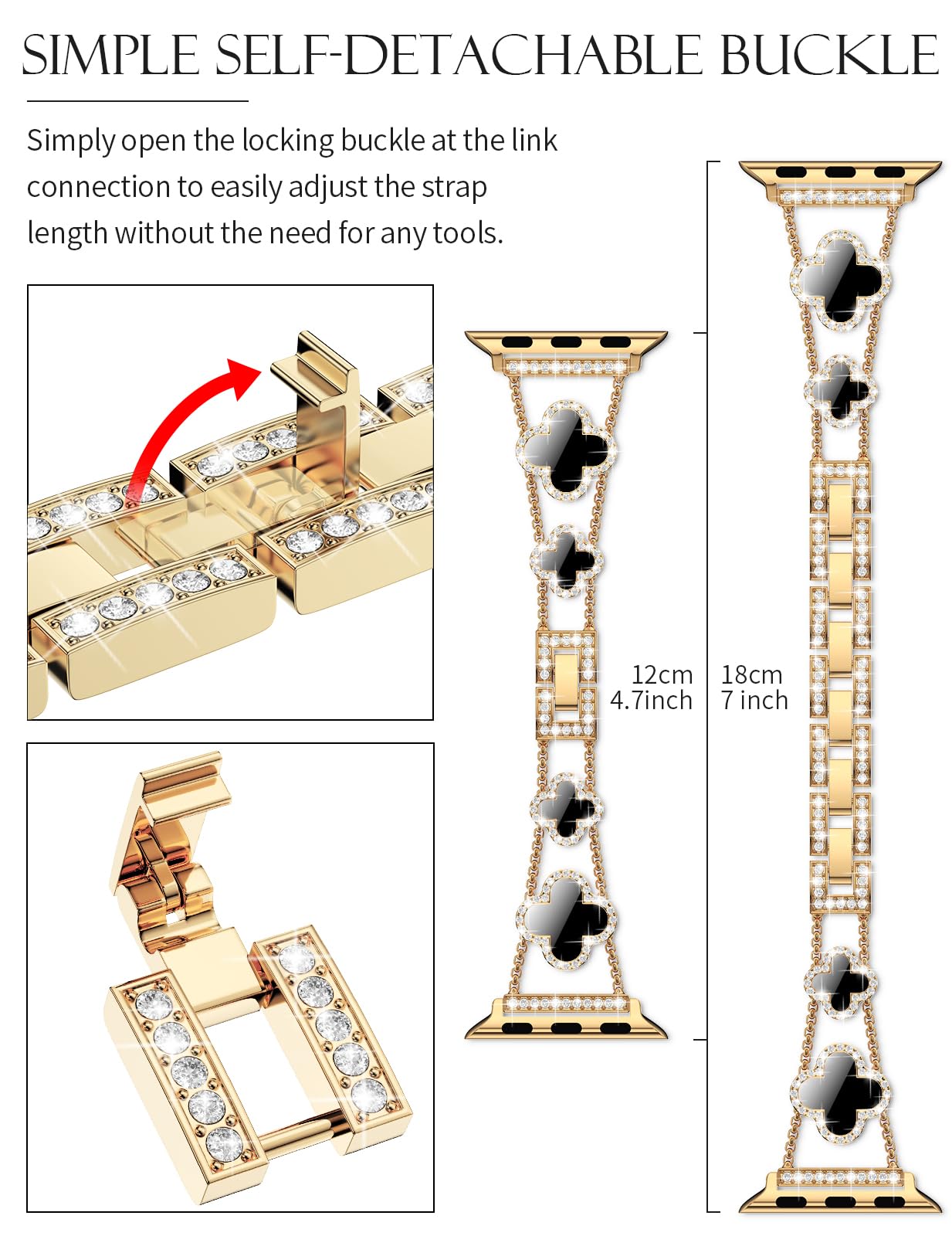 - 【Sparkling Diamiond】: Upgraded diamond-studded appearance, not only is the four-leaf clover surrounded by inset diamonds, but we have also embellished diamonds on each link, ensuring your Bling iwatch womens band shines from every angle. And the skeletonised design of the strap keeps your wrist comfortable and dry at all times, preventing skin irritation