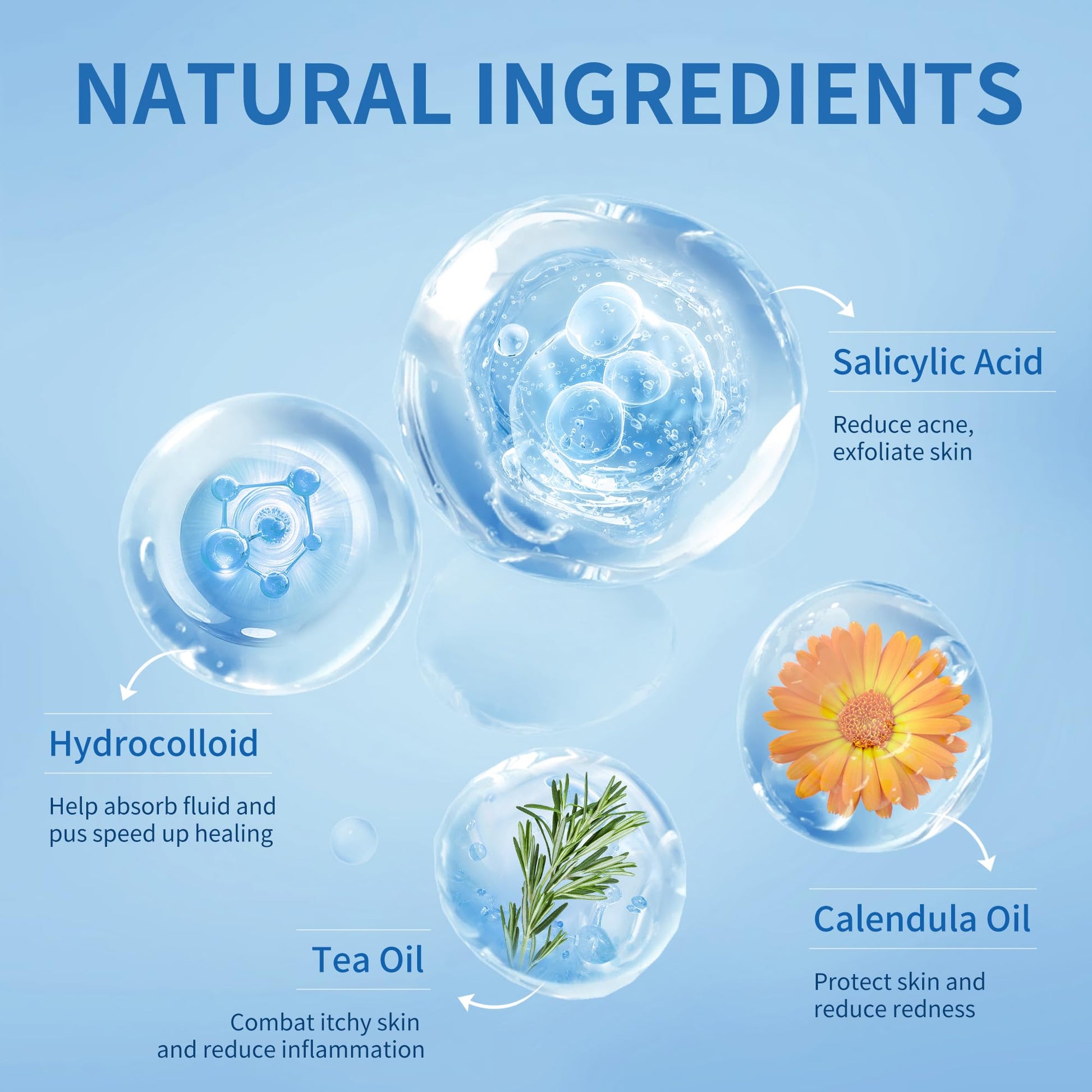- 🌿 Natural Ingredients: Our acne patches contain natural ingredients such as tea tree oil, salicylic acid, and calendula oil. These pimple patches for face are highly effective in absorbing gunk and shrinking spots