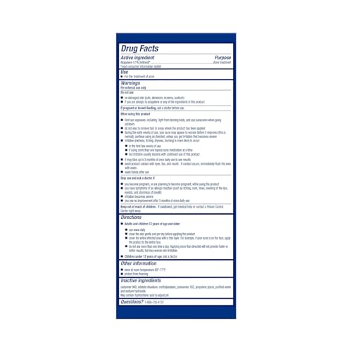 Details: Differin Gel Acne Treatment contains adapalene, an Rx-strength acne-fighting retinoid that helps clear breakouts where they start (works deep into pores in 5 minutes), helps prevents new acne from forming, and as a result, can restore skin's overall tone and texture. Adapalene is the first over-the-counter active ingredient for acne in more than 30 years. It clears acne with the power of an Rx without the prescription, prevents breakouts, blackheads, whiteheads, blemishes and clogged pores, and can be used to effectively treat acne, or maskne, caused by wearing face masks or facial coverings. When used as directed, you could start to see results in as little as 1 week, and when used every single day, Differin Gel can help reduce up to 87% of acne in just 12 weeks (Cunliffe et al 1998, Galderma Laboratories).