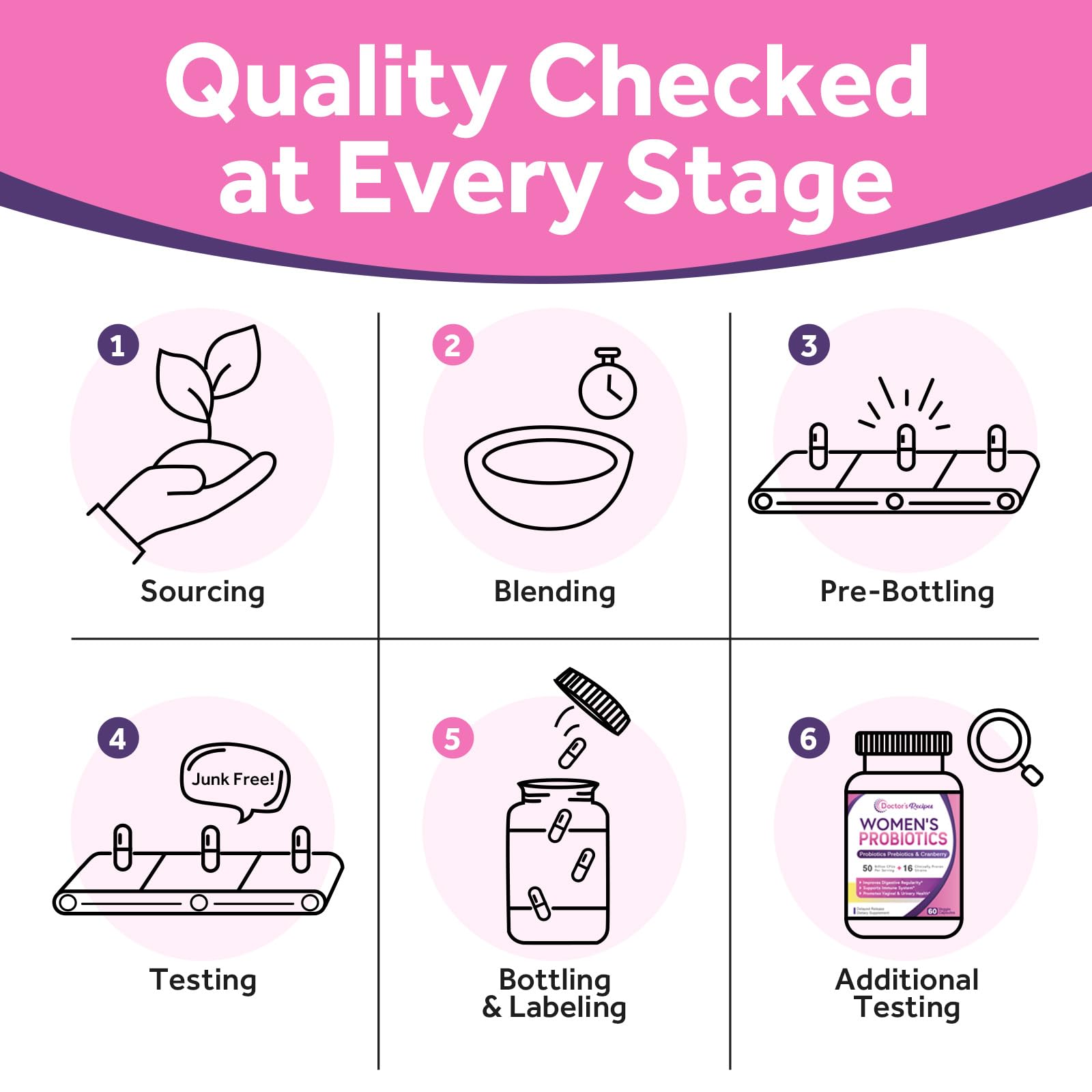 - Proudly Made In The USA: Our advanced strength formula is loaded with the highest grade & naturally sourced ingredients in FDA inspected and GMP certified facility in the USA. Doctor's Recipes Women Probiotics is 100% pure, natural, vegan friendly & NON-GMO with no soy, gluten and dairy.
