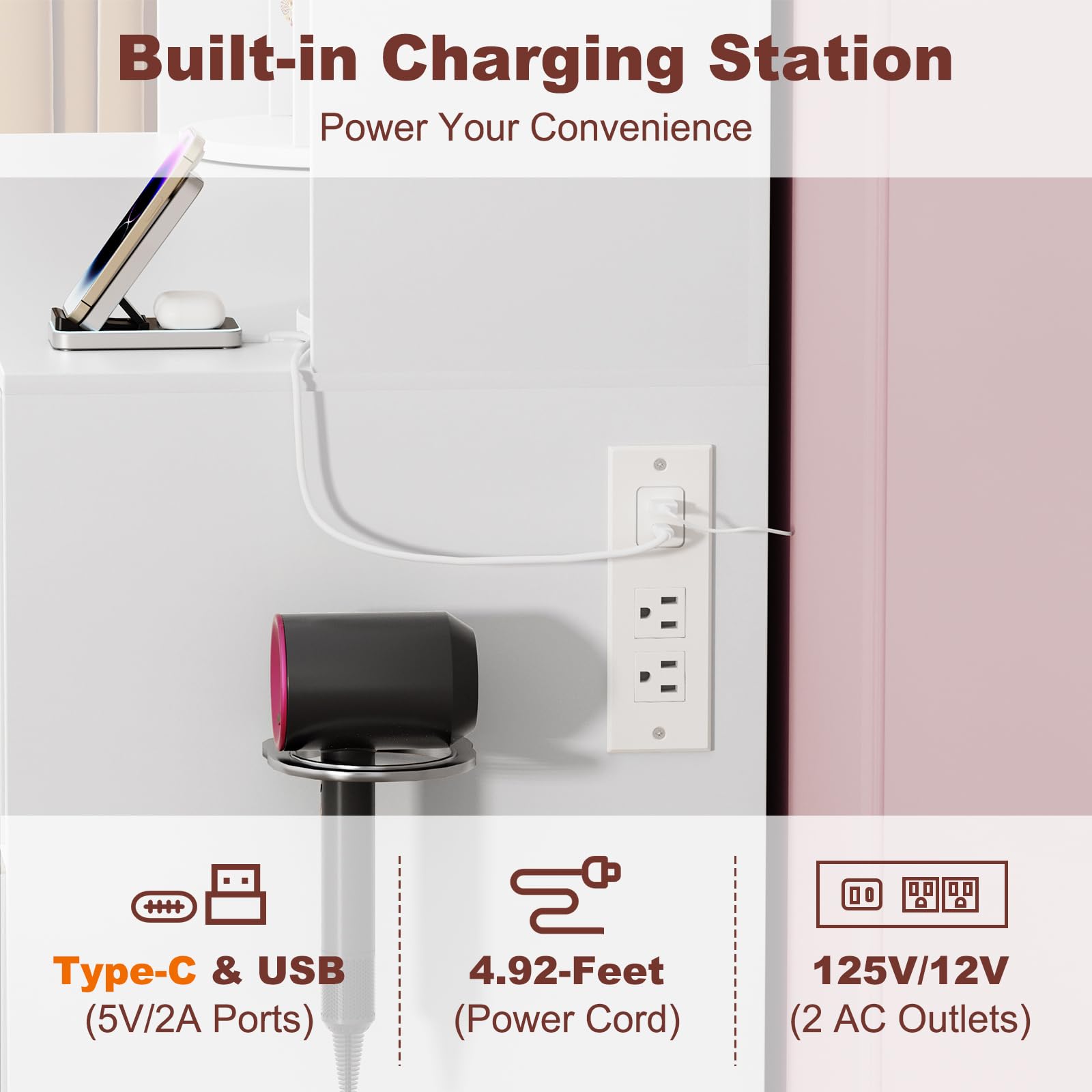 - 【Integrated Side-Mounted Charging Station】Strategically built into the makeup vanity desk with lights, this charging station (1 USB-C + 1 USB-A + 2 AC outlets) conquers countertop clutter. Centralize cords for phones, hair dryers, and other devices—eliminating cable tangles and outlet shortages while enhancing safety.