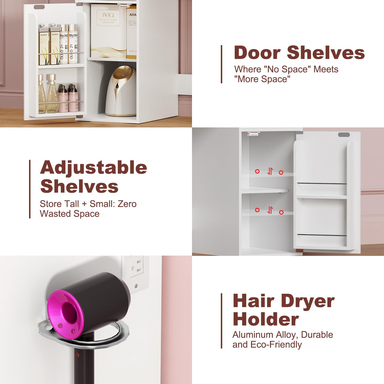 - 【Precision-Organized Storage Cabinets】Beneath the makeup vanity desk, two cabinets include door shelves and interior height-adjustable shelves. The door shelves offer quick access to daily essentials. Inside, adjustable shelves fit items of all sizes. This flexible layout makes the most of every inch.