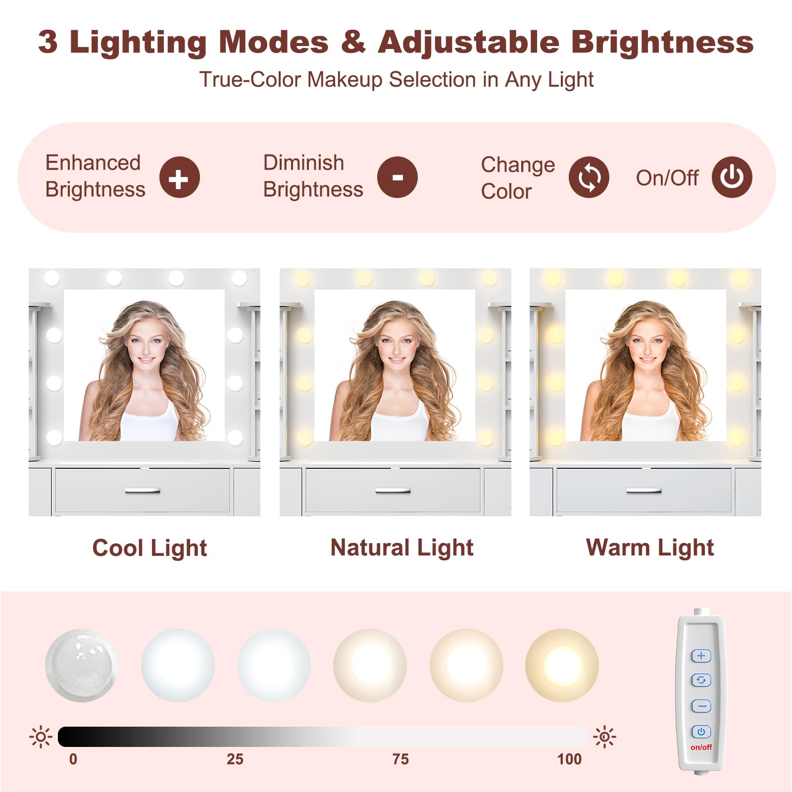 - 【Natural-Light-Mimicking LED Lighting】The makeup table features 10 LED bulbs offering 3 distinct lighting modes: Cool White, Warm White, and Soft Warm. Each mode provides dimmable brightness levels to simulate real-life lighting environments, helping you master light and shadow for true-color makeup application.